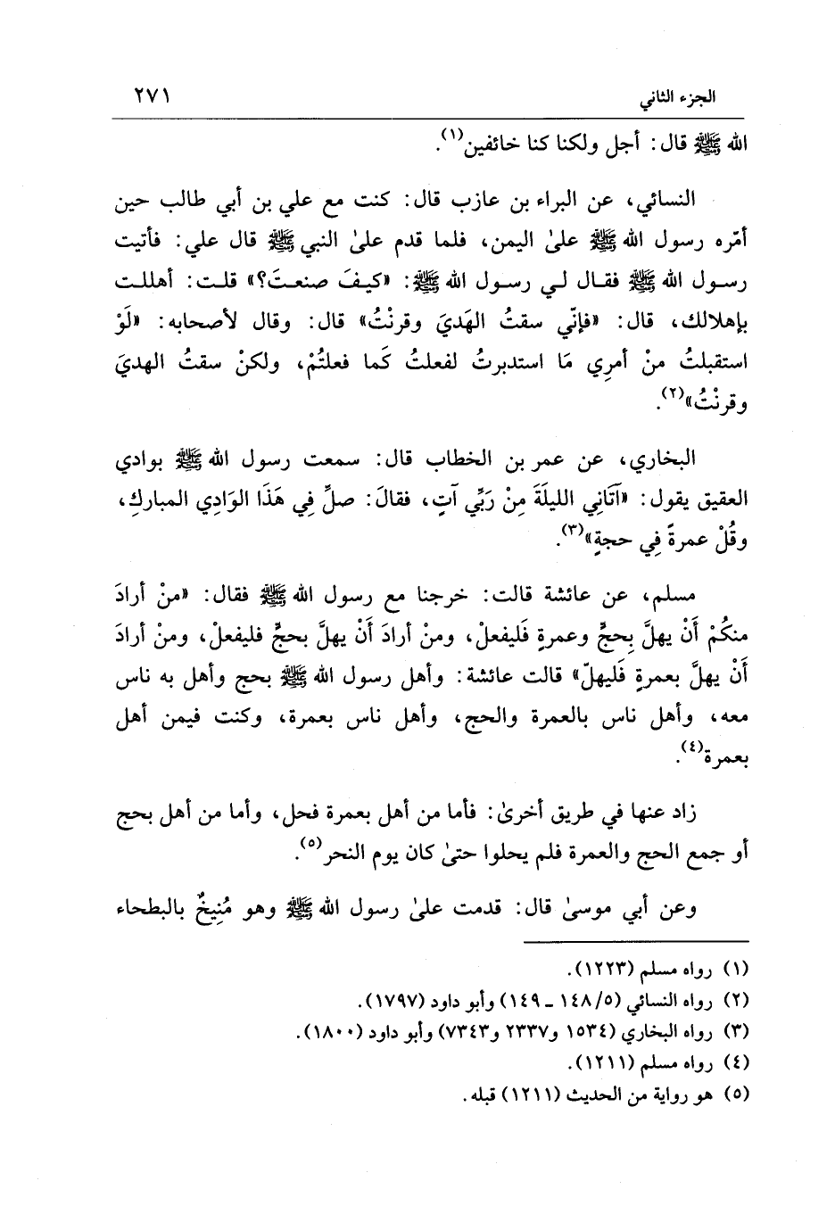 النسائي، عن البراء بن عازب قال: كنت مع علي بن أبي طالب حين أمّره رسول الله - صلى الله عليه وسلم - على اليمن، فلما قدم على النبي - صلى الله عليه وسلم - قال علي: فأتيت رسول الله - صلى الله عليه وسلم - فقال لي رسول الله - صلى الله عليه وسلم -: "كيفَ صنعتَ؟ " قلت: أهللت بإهلالك، قال: "فإنّي سقتُ الهَديَ وقرنْتُ" قال: وقال لأصحابه: "لَوْ استقبلتُ منْ أمرِي مَا استدبرتُ لفعلتُ كَما فعلتُمْ، ولكنْ سقتُ الهديَ وقرنْتُ" (¬2).