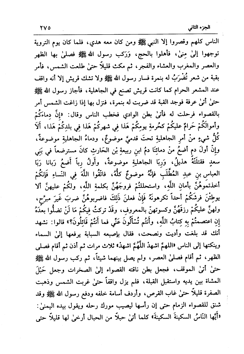 ولهنَّ عليكُمْ رزقَهُنَّ وكسوتهنّ بالمعروفِ، وقَدْ تركتُ فِيكُمْ مَا لَنْ تضلُّوا بعدَهُ إِنِ اعتصمتُمْ بِهِ كِتابُ اللهِ، وأَنتُم تُسْأَلُونَ عَنِّي فما أَنتُمْ قَائِلُونَ؟ " قالوا: نشهد أَنك قد بلغت وأديت ونصحت، فقال بإصبعه السبابة يرفعها إلى السماء وينكتها إلى الناس "اللهمَّ اشهدْ اللَّهُمَّ اشهدْ" ثلاث مرات ثم أذن ثم أقام فصلى الظهر، ثم أقام فصلى العصر، ولم يصل بينهما شيئًا، ثم ركب رسول الله - صلى الله عليه وسلم - حتى أتى الموقف، فجعل بطن ناقته القصواء إلى الصخرات وجعل حَبْلَ المشاة بين يديه واستقبل القبلة، فلم يزل واقفًا حتى غربت الشمس وذهبت الصفرة قليلًا حتى غاب القرص، وأردف أسامة خلفه ودفع رسول الله - صلى الله عليه وسلم - وقد شنق للقصواء الزمام حتى إن رأسها ليصيب مورك رحله ويقول بيده اليمنى: "أَيَّها النّاسُ السكينةَ السكينةَ" كلما أتى حبلًا من الحبال أرخى لها قليلًا حتى