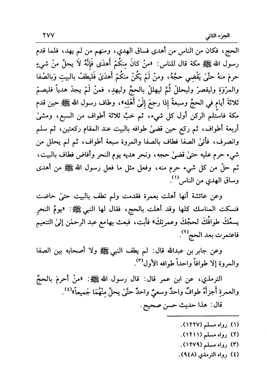 وعن جابر بن عبد الله قال: لم يطف النبي - صلى الله عليه وسلم - ولا أصحابه بين الصفا والمروة إلا طوافًا واحدًا طوافه الأول (¬3).