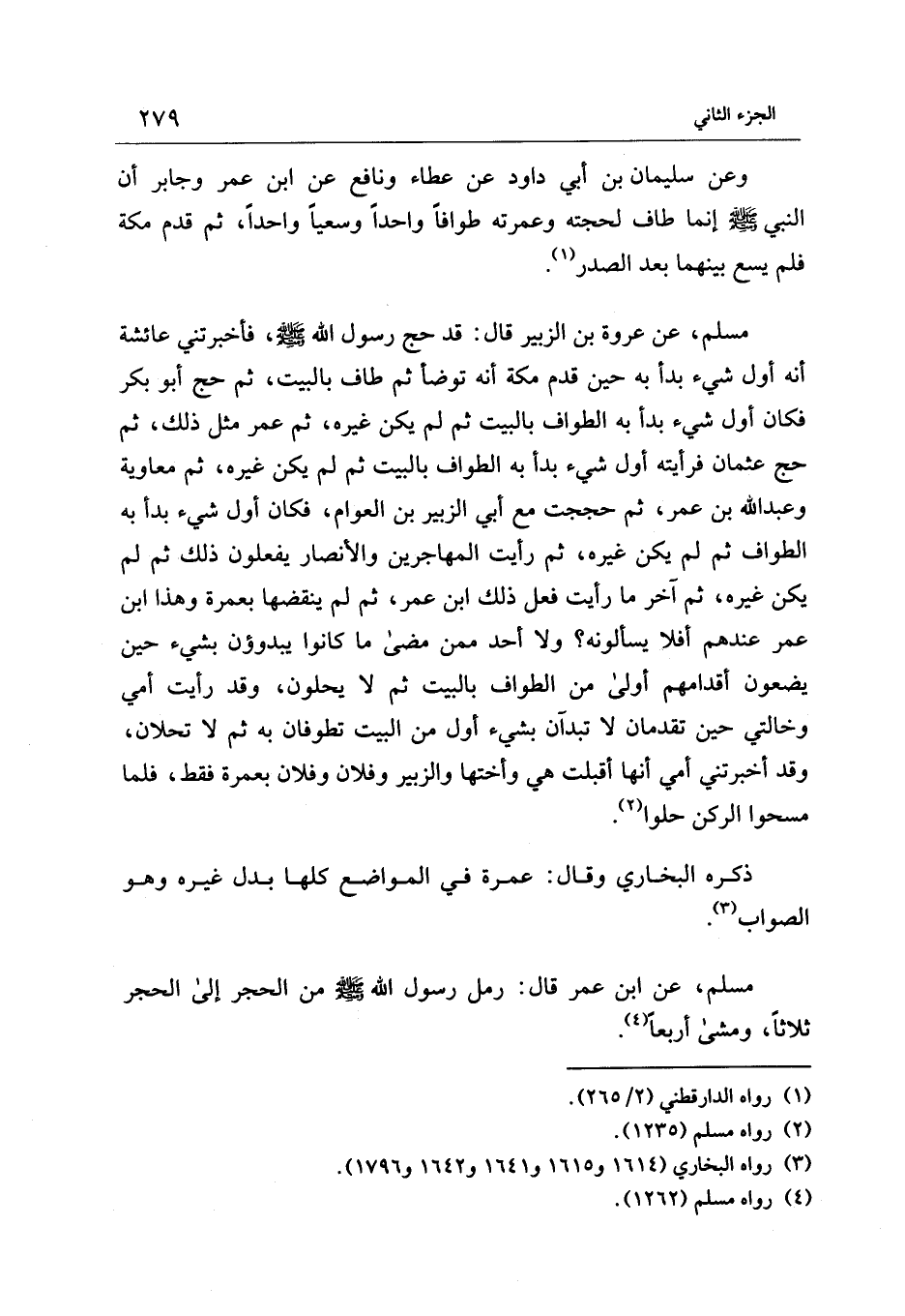 مسلم، عن عروة بن الزبير قال: قد حج رسول الله - صلى الله عليه وسلم -، فأخبرتني عائشة أنه أول شيء بدأ به حين قدم مكة أنه توضأ ثم طاف بالبيت، ثم حج أبو بكر فكان أول شيء بدأ به الطواف بالبيت ثم لم يكن غيره، ثم عمر مثل ذلك، ثم حج عثمان فرأيته أول شيء بدأ به الطواف بالبيت ثم لم يكن غيره، ثم معاوية وعبد الله بن عمر، ثم حججت مع أبي الزبير بن العوام، فكان أول شيء بدأ به الطواف ثم لم يكن غيره، ثم رأيت المهاجرين والأنصار يفعلون ذلك ثم لم يكن غيره، ثم آخر ما رأيت فعل ذلك ابن عمر، ثم لم ينقضها بعمرة وهذا ابن عمر عندهم أفلا يسألونه؟ ولا أحد ممن مضى ما كانوا يبدوؤن بشيء حين يضعون أقدامهم أولى من الطواف بالبيت ثم لا يحلون، وقد رأيت أمي