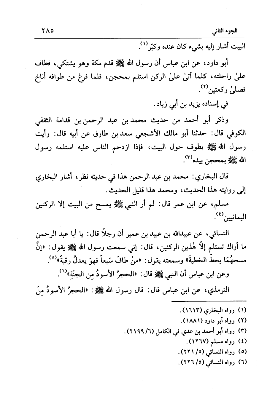 النسائي، عن عبيد الله بن عبيد بن عمير أن رجلًا قال: يا أبا عبد الرحمن ما أراك تستلم إلا هذين الركنين، قال: إني سمعت رسول الله - صلى الله عليه وسلم - يقول: "إنَّ مسحهُمَا يحطّ الخطيةَ" وسمعته يقول: "منْ طافَ سَبعًا فهوَ يعدلُ رقبة" (¬5).