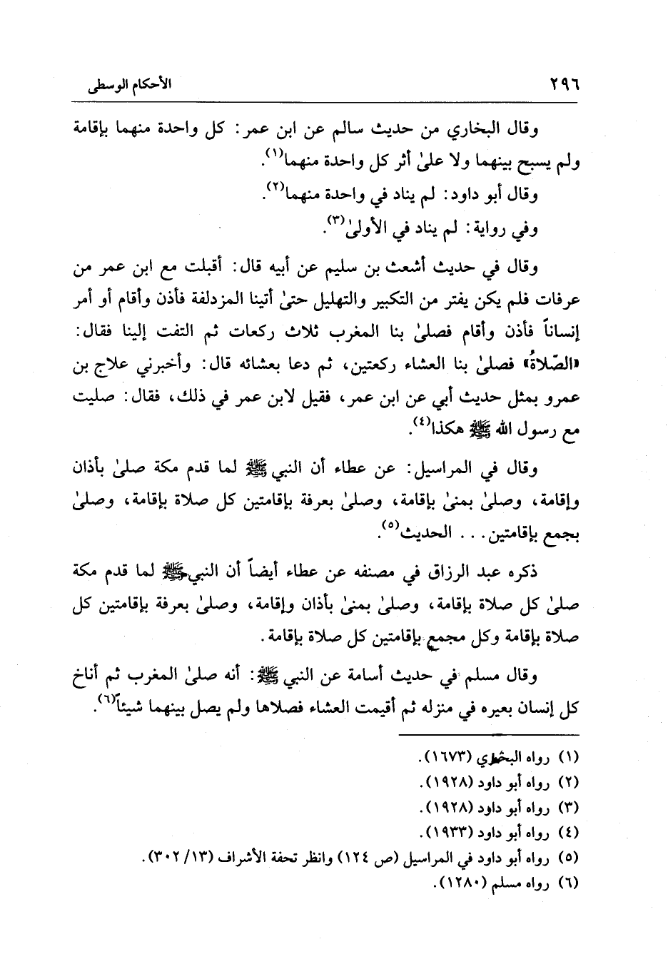 وقال البخاري من حديث سالم عن ابن عمرة كل واحدة منهما بإقامة ولم يسبح بينهما ولا على أثر كل واحدة منهما (¬1).