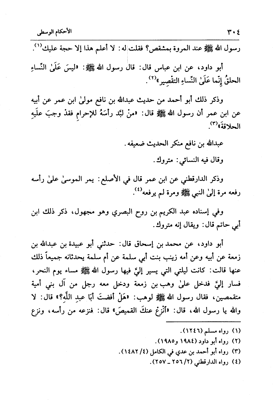 أبو داود، عن ابن عباس قال: قال رسول الله - صلى الله عليه وسلم -: "ليسَ عَلَى النِّساءِ الحلقُ إِنّما عَلَى النِّساءِ التقْصِير" (¬2).