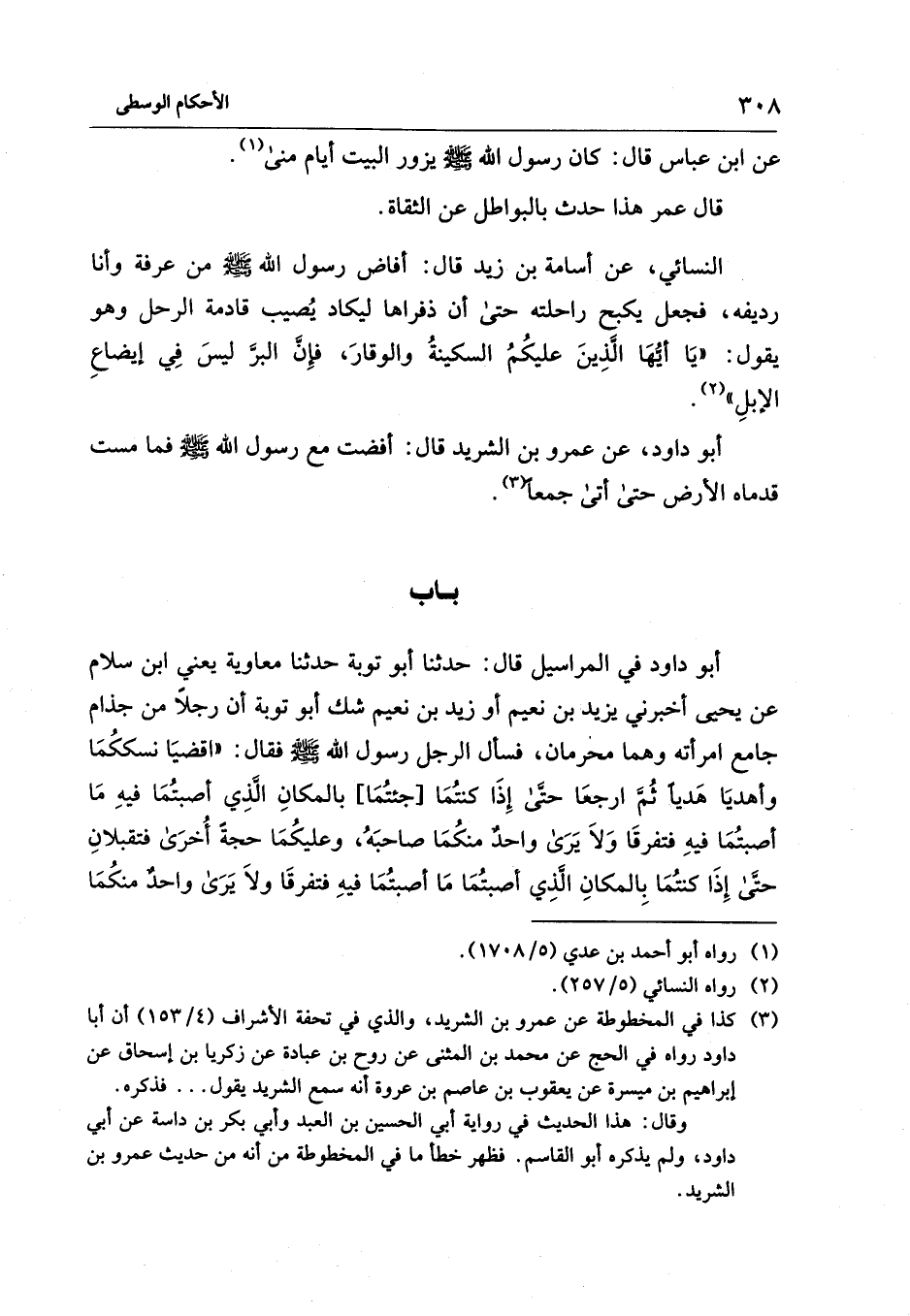 (¬3) كذا في المخطوطة عن عمرو بن الشريد، والذكره في تحفة الأشراف (4/ 153) أن أبا داود رواه في الحج عن محمد بن المثنى عن روح بن عبادة عن زكريا بن إسحاق عن إبراهيم بن ميسرة عن يعقوب بن عاصم بن عروة أنه سمع الشريد يقول. . . فذكره.