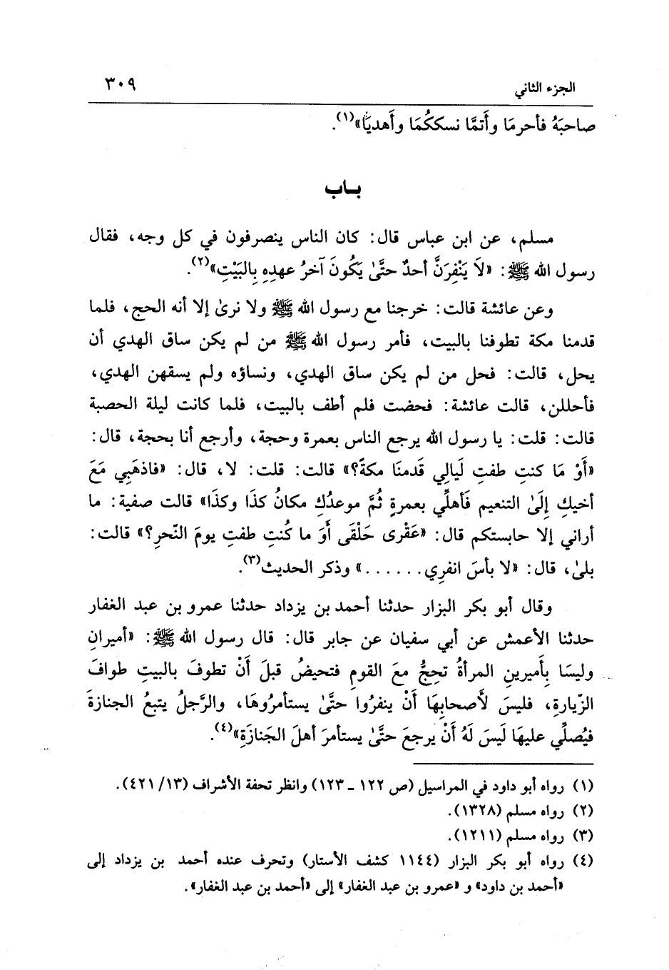 وقال أبو بكر البزار حدثنا أحمد بن يزداد حدثنا عمرو بن عبد الغفار حدثنا الأعمش عن أبي سفيان عن جابر قال: قال رسول الله - صلى الله عليه وسلم -: "أميرانِ وليسَا بِأَميرينِ المرأةُ تحجُّ معَ القومِ فتحيضُ قبلَ أَنْ تطوفَ بالبيتِ طوافَ الزّيارةِ، فليسَ لأَصحابِها أَنْ ينفرُوا حتَّى يستأمرُوها، والرَّجلُ يتبعُ الجنازةَ فيُصلِّي عليها لَيسَ لَهُ أَنْ يرجعَ حتَّى يستأمرَ أهلَ الجَنازَةِ" (¬4).