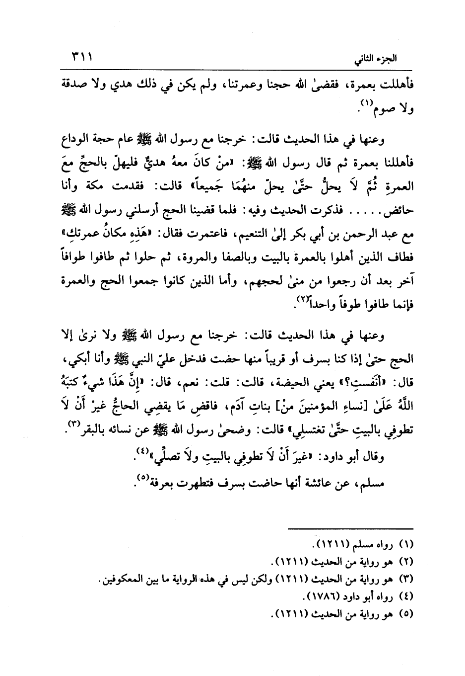 وعنها في هذا الحديث قالت: خرجنا مع رسول الله - صلى الله عليه وسلم - عام حجة الوداع فأهللنا بعمرة ثم قال رسول الله - صلى الله عليه وسلم -: "منْ كانَ معهُ هديٌّ فليهلّ بالحجِّ معَ العمرةُ ثُمَّ لاَ يحلُّ حتَّى يحلّ منهُمَا جَميعًا" قالت: فقدمت مكة وأنا حائض. . . . . فذكرت الحديث وفيه: فلما قضينا الحج أرسلني رسول الله - صلى الله عليه وسلم - مع عبد الرحمن بن أبي بكر إلى التنعيم، فاعتمرت فقال: "هذِهِ مكانُ عمرتكِ" فطاف الذين أهلوا بالعمرة بالبيت وبالصفا والمروة، ثم حلوا ثم طافوا طوافًا آخر بعد أن رجعوا من منى لحجهم، وأما الذين كانوا جمعوا الحج والعمرة فإنما طافوا طوفًا واحدًا (¬2).