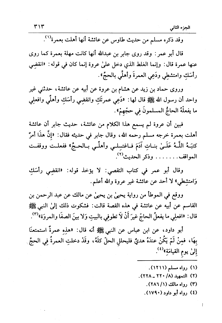 قال أبو عمر: وقد روى جابر بن عبد الله أنها كانت مهلة بعمرة كما روى عنها عمرة قال: وإنما الغلط الذي دخل على عروة إنما كان في قوله: "انقضِي رأسَكِ وامتشطِي ودَعِي العمرةَ وأهلِّي بالحجِّ".