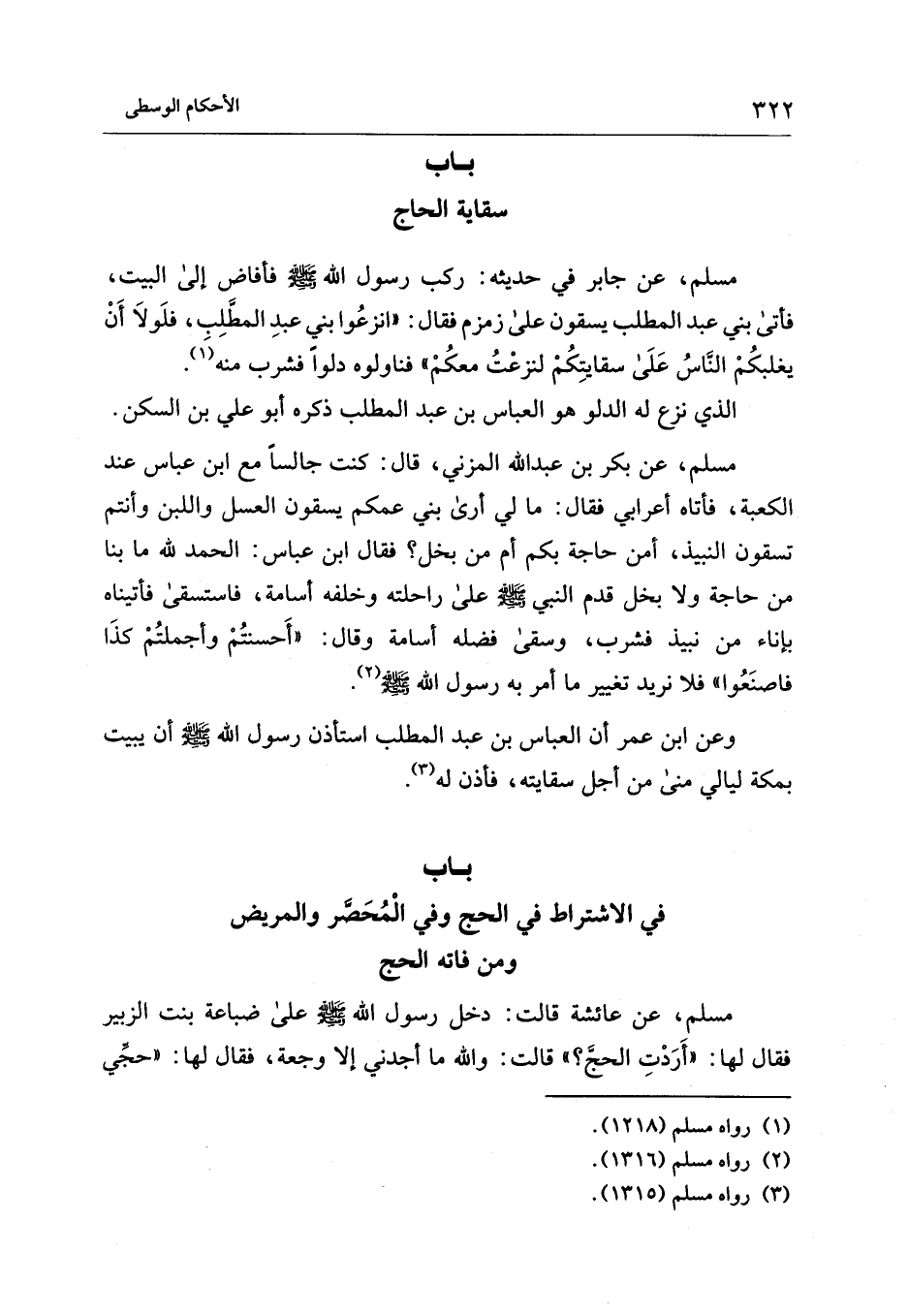 مسلم، عن عائشة قالت: دخل رسول الله - صلى الله عليه وسلم - على ضباعة بنت الزبير فقال لها: "أَردْتِ الحجِّ؟ " قالت: والله ما أجدني إلا وجعة، فقال لها: "حجِّي
