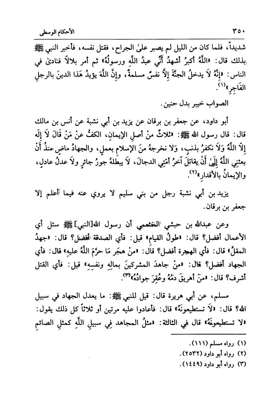 أبو داود، عن جعفر بن برقان عن يزيد بن أبي نشبة عن أنس بن مالك قال: قال رسول الله - صلى الله عليه وسلم -: "ثلاثٌ منْ أصلِ الإيمانِ، الكفُّ عنْ مَنْ قَالَ لاَ إِلَه إِلا اللهُ وَلاَ نكفرُ بذنبٍ، وَلا نخرجهُ منَ الإسلامِ بعملٍ، والجهادُ ماضٍ منذُ أَنْ بعثنِي اللهُ إِلى أَن يقاتلَ آخرُ أمّتِي الدجالَ، لاَ يبطلهُ جورُ جائرٍ ولاَ عدلُ عادلٍ، والإيمانُ بالأقدارِ" (¬2).