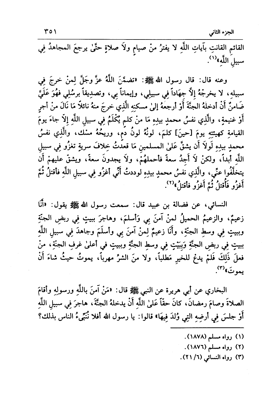 وعنه قال: قال رسول الله - صلى الله عليه وسلم -: "تضمَّن اللهُ عزَّ وجَلَّ لِمنْ خرجَ فِي سبيلهِ، لا يخرجْهُ إِلَّا جهَادًا فِي سبيلِي، وإيمانًا بِي، وتصدِيقًا برسُلِي فهُوَ عَلَيَّ ضَامنٌ أَنْ أدخلهُ الجنَّةَ أوْ أرجعهُ إلى مسكنِهِ الَّذِي خرجَ منهُ نائلًا مَا نَالَ منْ أجرٍ أَوْ غنيمةٍ، والَّذي نفسُ محمدٍ بيدهِ مَا منْ كلمٍ يكْلَمُ فِي سبيلِ الله إِلّا جاءَ يومَ القيامةِ كهيئتِهِ يومَ [حينَ] كلمَ، لونُهُ لونُ دمٍ، وريحُهُ مسْك، والَّذِي نفسُ محمدِ بيدهِ لَولاَ أَن يشقَّ عَلى المسلمينِ مَا قعدتُ خِلافَ سريةٍ تغزُو فِي سبيلِ اللهِ أبدًا، ولكنْ لاَ أَجِدُ سعةً فأحملهُمْ، ولاَ يجدونَ سعةً، ويشقّ عليهمْ أَن يتخلَّفُوا عني، والَّذي نفسُ محمدٍ بيده لوددتُ أَنِّي أغزُو فِي سبيلِ اللهِ فأقتلُ ثُمَّ أَغزُو فَأُقتلُ ثم أَغزُو فأقتلُ" (¬2).