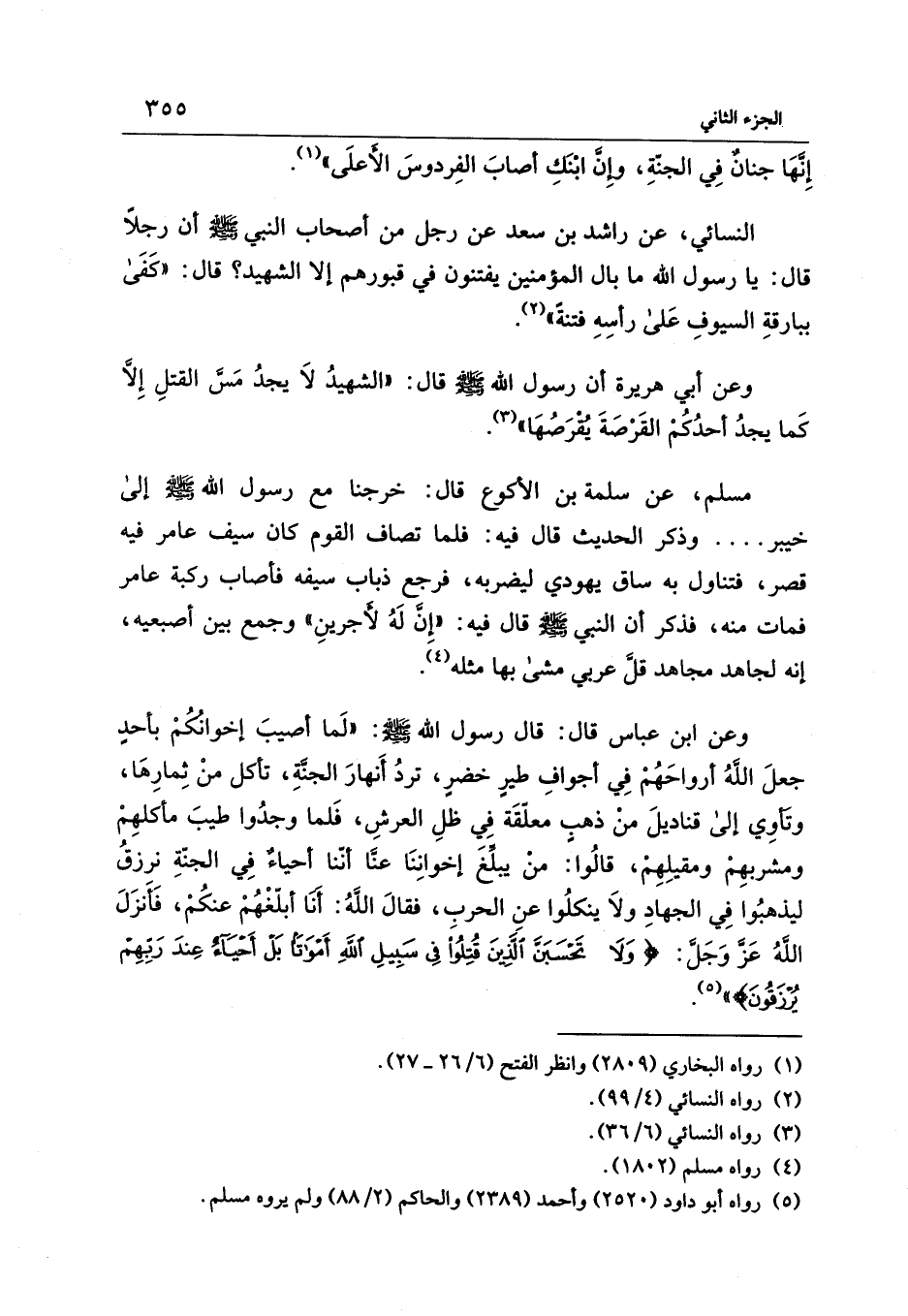 النسائي، عن راشد بن سعد عن رجل من أصحاب النبي - صلى الله عليه وسلم - أن رجلًا قال: يا رسول الله ما بال المؤمنين يفتنون في قبورهم إلا الشهيد؟ قال: "كَفَى ببارقةِ السيوفِ عَلى رأسِهِ فتنةً" (¬2).