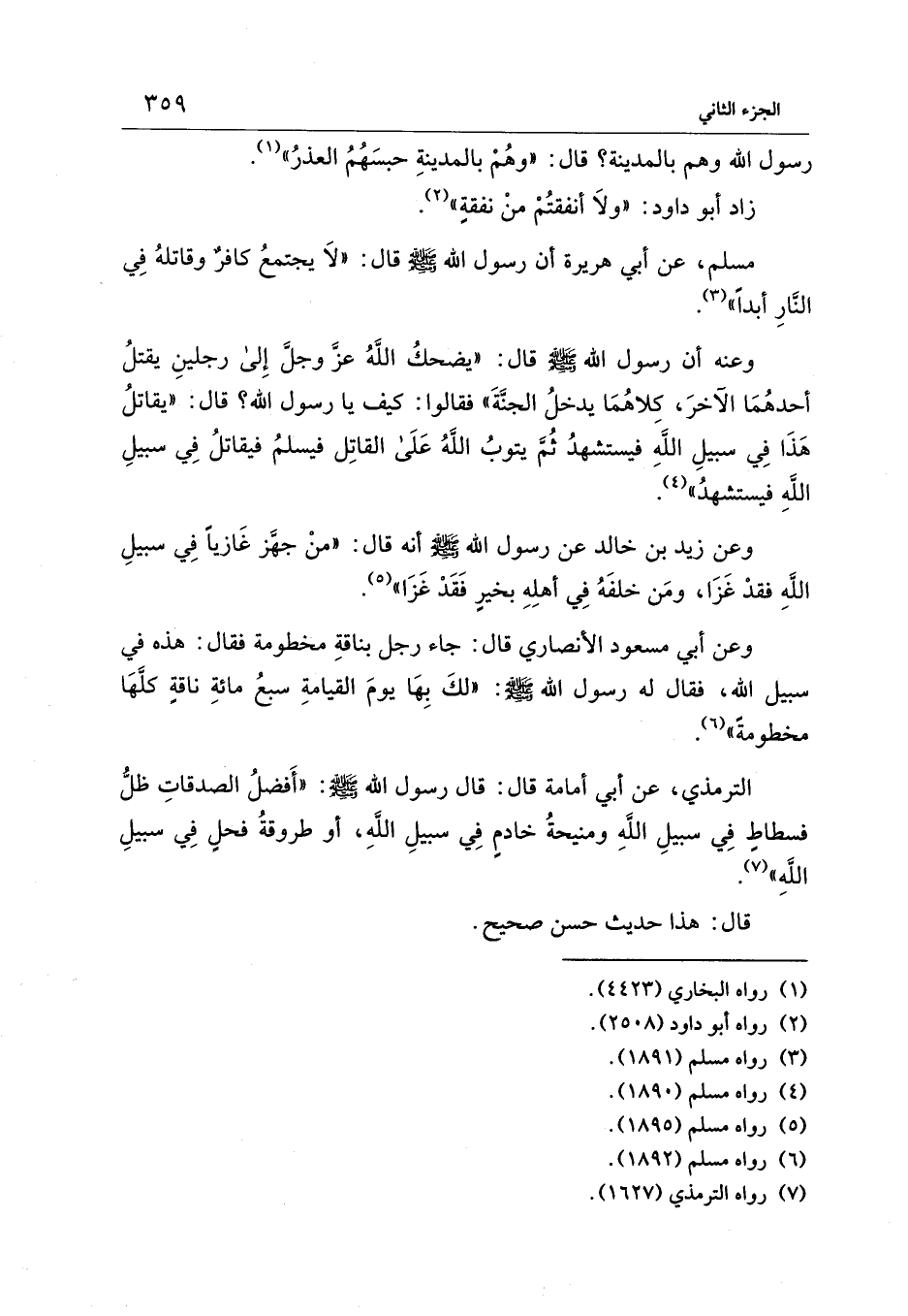 وعن زيد بن خالد عن رسول الله - صلى الله عليه وسلم - أنه قال: "منْ جهَّز غَازيًا فِي سبيلِ اللهِ فقدْ غَزَا، ومَن خلفَهُ فِي أهلِهِ بخيرٍ فَقَدْ غَزَا" (¬5).