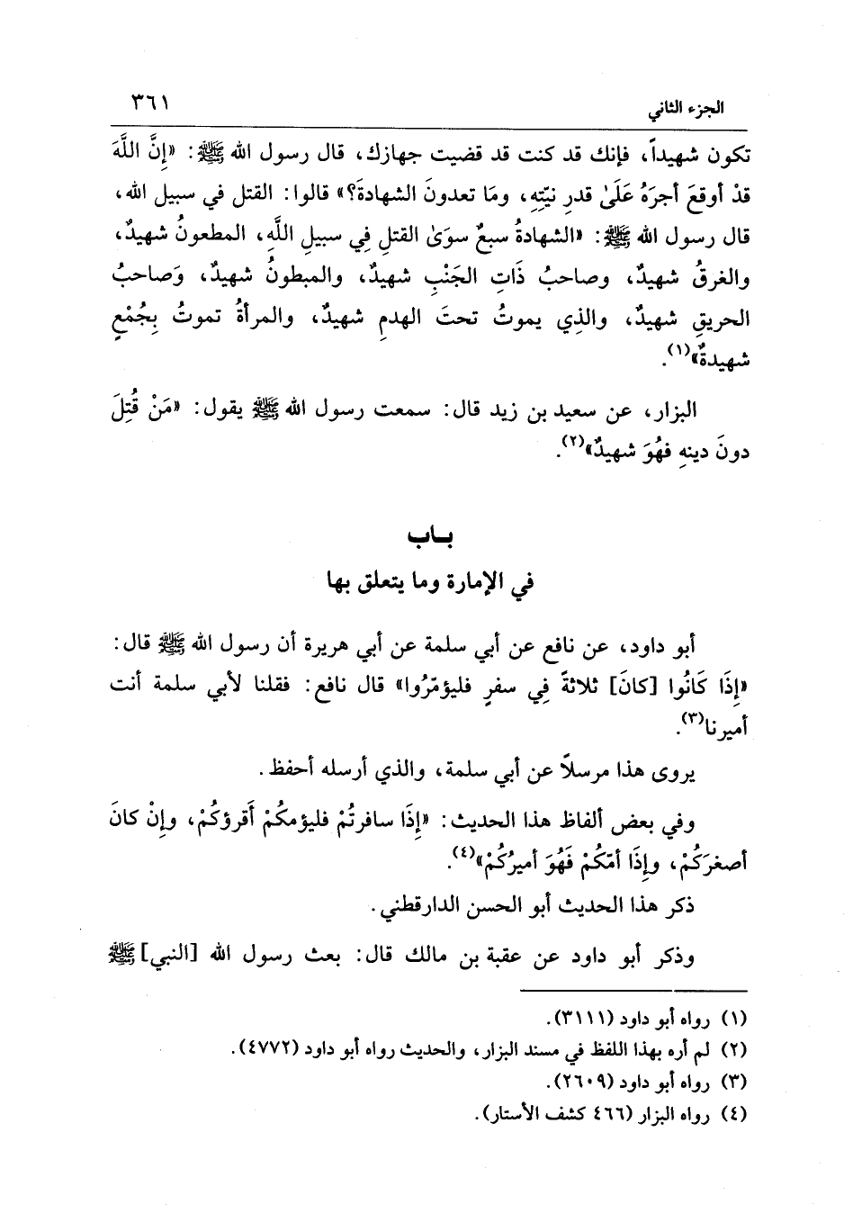 أبو داود، عن نافع عن أبي سلمة عن أبي هريرة أن رسول الله - صلى الله عليه وسلم - قال: "إِذَا كَانُوا [كانَ] ثلاثةً فِي سفرٍ فليؤمّرُوا" قال نافع: فقلنا لأبي سلمة أنت أميرنا (¬3).