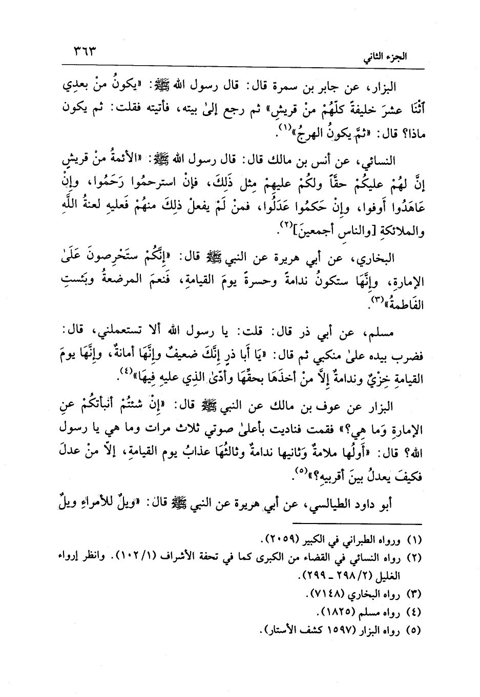 البزار عن عوف بن مالك عن النبي - صلى الله عليه وسلم - قال: "إِنْ شئتُمْ أنبأتكُمْ عنِ الإمارةِ وَما هِي؟ " فقمت فناديت بأعلى صوتي ثلاث مرات وما هي يا رسول الله؟ قال: "أَولُها ملامةٌ وَثانيها ندامةٌ وثالثُهَا عذابُ يوم القيامةِ، إلّا منْ عدلَ فكيفَ يعدلُ بينَ أقربيهِ؟ " (¬5).