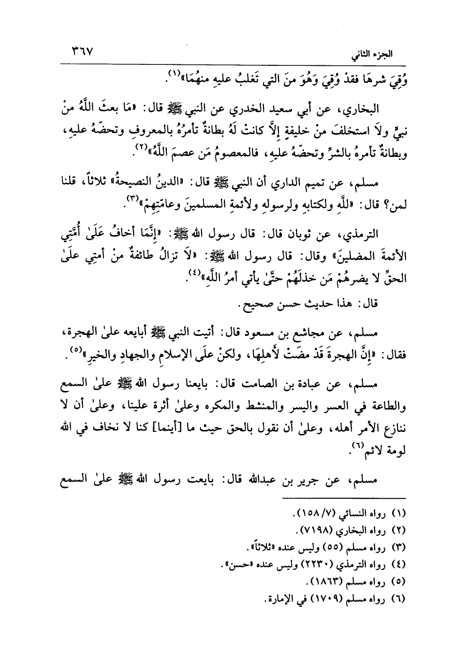 مسلم، عن عبادة بن الصامت قال: بايعنا رسول الله - صلى الله عليه وسلم - على السمع والطاعة في العسر واليسر والمنشط والمكره وعلى أثرة علينا، وعلى أن لا ننازع الأمر أهله، وعلى أن نقول بالحق حيث ما [أينما] كنا لا نخاف في الله لومة لائم (¬6).