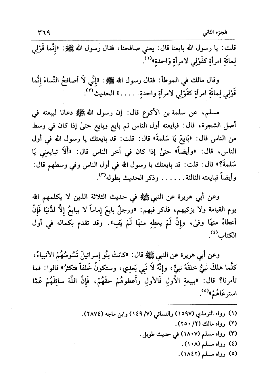 وقال مالك في الموطأ: فقال رسول الله - صلى الله عليه وسلم -: "إِنِّي لا أصافحُ النِّساءَ إِنَّما قَوْلي لِمائَةِ امرأةٍ كقَوْلي لامرأةٍ واحدةٍ. . . . ." الحديث (¬2).