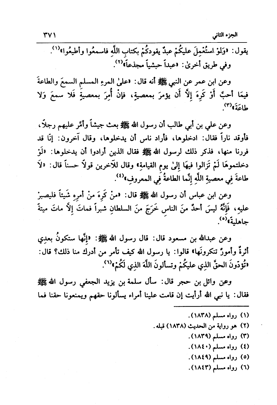وعن وائل بن حجر قال: سأل سلمة بن يزيد الجعفي رسول الله - صلى الله عليه وسلم - فقال: يا نبي الله أرأيت إن قامت علينا أمراء يسألونا حقهم ويمنعونا حقنا فما