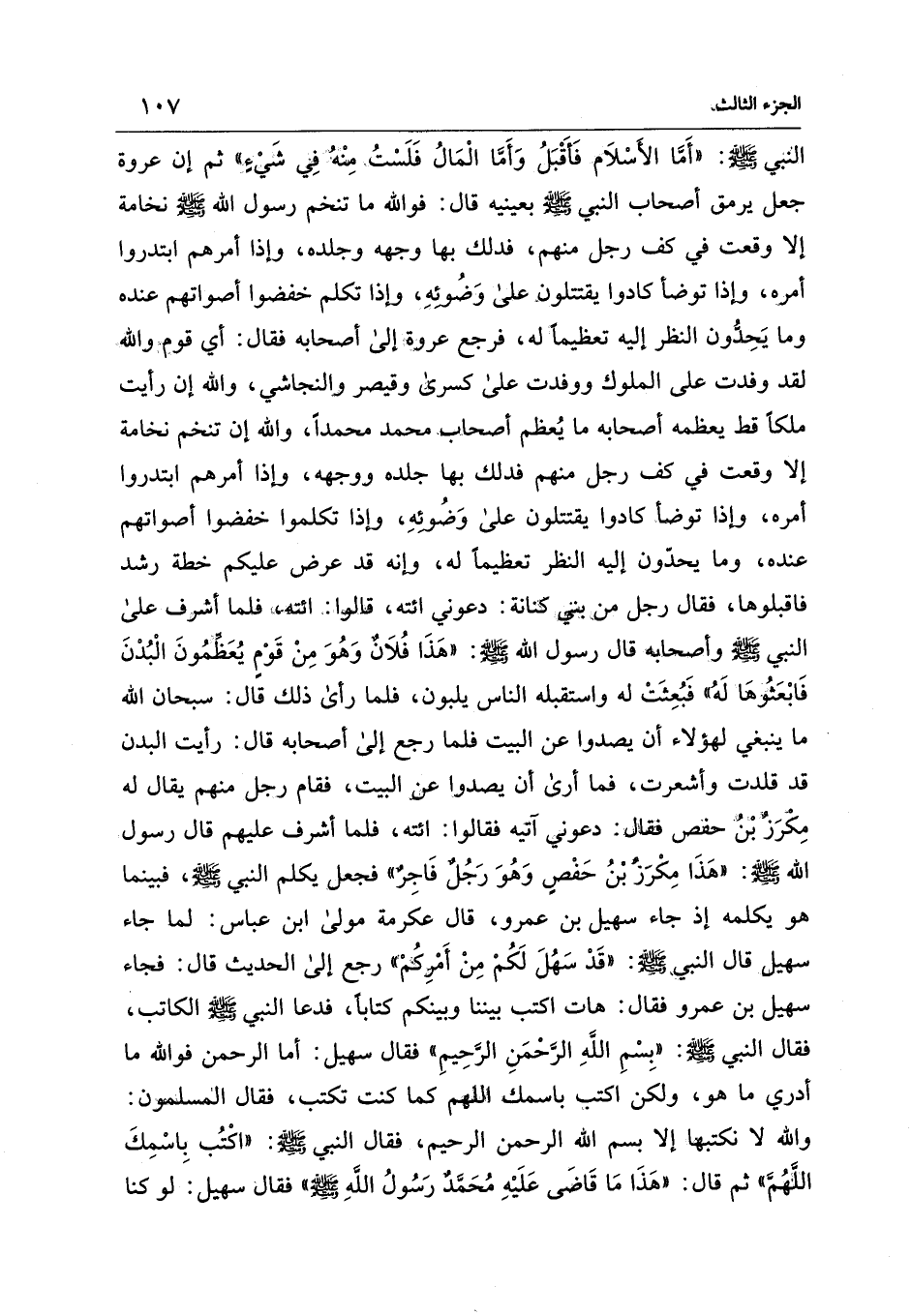 النبي - صلى الله عليه وسلم -: "أَمَّا الإِسْلَام فَأقْبَلُ وَأَمَّا الْمَالُ فَلَسْتُ مِنْهْ في شَيْءٍ" ثم إن عروة جعل يرمق أصحاب النبي - صلى الله عليه وسلم - بعينيه قال: فوالله ما تنخم رسول الله - صلى الله عليه وسلم - نخامة إلا وقعت في كف رجل منهم، فدلك بها وجهه وجلده، وإذا أمرهم ابتدروا أمره، وإذا توضأ كادوا يقتتلون على وَضُوئِهِ، وإذا تكلم خفضوا أصواتهم عنده وما يَحِدُّون النظر إليه تعظيمًا له، فرجع عروة إلى أصحابه فقال: أي قوم. والله لقد وفدت على الملوك ووفدت على كسرى وقيصر والنجاشي، والله إن رأيت ملكًا قط يعظمه أصحابه ما يُعظم أصحاب محمد محمدًا، والله إن تنخم نخامة إلا وقعت في كف رجل منهم فدلك بها جلده ووجهه، وإذا أمرهم ابتدروا أمره، وإذا توضأ كادوا يقتتلون على وَضُوئهِ، وإذا تكلموا خفضوا أصواتهم عنده، وما يحدّون إليه النظر تعظيمًا له، وإنه قد عرض عليكم خطة رشد فاقبلوها، فقال رجل من بني كنانة: دعوني ائته، قالوا: ائته، فلما أشرف على النبي - صلى الله عليه وسلم - وأصحابه قال رسول الله - صلى الله عليه وسلم -: "هَذَا فُلَانٌ وَهُوَ مِنْ قَوْمٍ يُعَظِّمُونَ الْبُدْنَ فَابْعَثُوهَا لَهُ" فَبُعِثَتْ له واستقبله الناس يلبون، فلما رأى ذلك قال: سبحان الله ما ينبغي لهؤلاء أن يصدوا عن البيت فلما رجع إلى أصحابه قال: رأيت البدن قد قلدت وأشعرت، فما أرى أن يصدوا عن البيت، فقام رجل منهم يقال له مِكْرَزٌ بْنُ حفص فقال: دعوني آتيه فقالوا: ائته، فلما أشرف عليهم قال رسول الله - صلى الله عليه وسلم -: "هَذَا مِكْرَزٌ بْنُ حَفْصٍ وَهُوَ رَجُلٌ فَاجِرٌ" فجعل يكلم النبي - صلى الله عليه وسلم -، فبينما هو يكلمه إذ جاء سهيل بن عمرو، قال عكرمة مولى ابن عباس: لما جاء سهيل قال النبي - صلى الله عليه وسلم -: "قَدْ سَهُلَ لَكُمْ مِنْ أَمْرِكُمْ" رجع إلى الحديث قال: فجاء سهيل بن عمرو فقال: هات اكتب بيننا وبينكم كتابًا، فدعا النبي - صلى الله عليه وسلم - الكاتب، فقال النبي - صلى الله عليه وسلم -: "بِسْمِ اللهِ الرَّحْمَنِ الرَّحِيمِ" فقال سهيل: أما الرحمن فوالله ما أدري ما هو، ولكن اكتب باسمك اللهم كما كنت تكتب، فقال المسلمون: والله لا نكتبها إلا بِسْمِ اللَّهِ الرَّحْمَنِ الرَّحِيمِ، فقال النبي - صلى الله عليه وسلم -: "اكْتُب بِاسْمِكَ اللَّهُمَّ" ثم قال: "هَذَا مَا قَاضَى عَلَيْهِ مُحَمَّدٌ رَسُولُ اللهِ - صلى الله عليه وسلم -" فقال سهيل: لو كنا