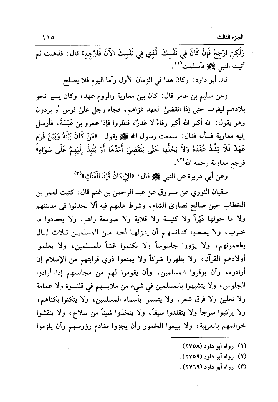 سفيان الثوري عن مسروق عن عبد الرحمن بن غنم قال: كتبت لعمر بن الخطاب حين صالح نصارى الشام، وشرط عليهم فيه ألا يحدثوا في مدينتهم ولا ما حولها دَيْرًا ولا كنيسة ولا قلاية ولا صومعة راهب ولا يجددوا ما خرب، ولا يمنعوا كنائسهم أن ينزلها أحد من المسلمين ثلاث ليال يطعمونهم، ولا يؤووا جاسوسًا ولا يكتموا غشًا للمسلمين، ولا يعلموا أولادهم القرآن، ولا يظهروا شركًا ولا يمنعوا ذوي قرابتهم من الإسلام إن أرادوه، وأن يوقروا المسلمين، وأن يقوموا لهم من مجالسهم إذا أرادوا الجلوس، ولا يتشبهوا بالمسلمين في شيء من ملابسهم في قلنسوة ولا عمامة ولا نعلين ولا فرق شعر، ولا يتسموا بأسماء المسلمين، ولا يتكنوا بكناهم، ولا يركبوا سرجًا ولا يتقلدوا سيفًا، ولا يتخذوا شيئًا من سلاح، ولا ينقشوا خواتمهم بالعربية، ولا يبيعوا الخمور وأن يجزوا مقادم رؤوسهم وأن يلزموا