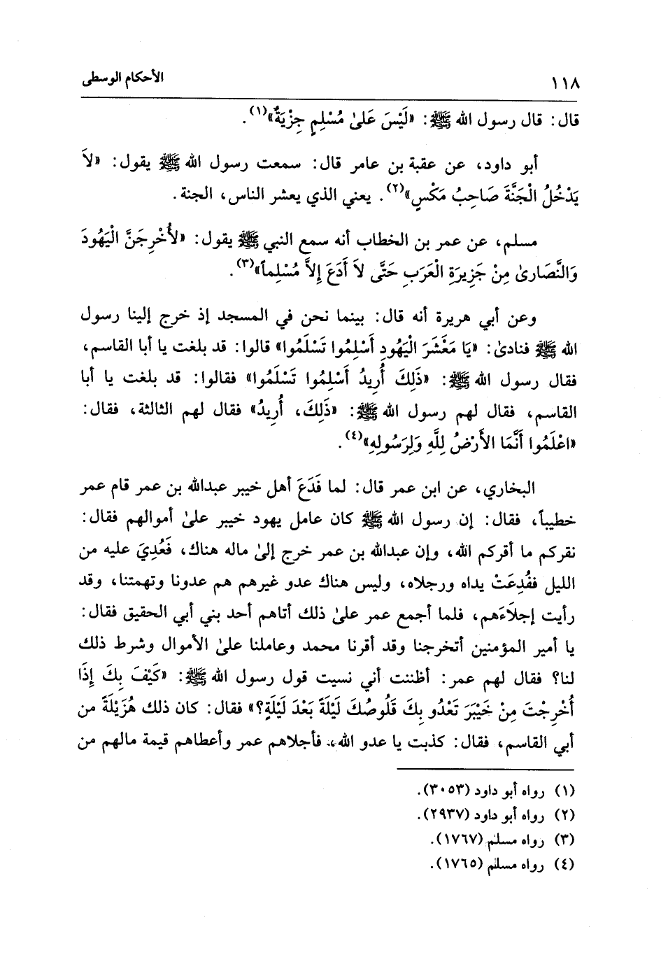 مسلم، عن عمر بن الخطاب أنَّه سمع النبي - صلى الله عليه وسلم - يقول: "لأُخْرِجَنَّ الْيَهُودَ وَالنَّصَارى مِن جَزِيرَةِ الْعَرَبِ حَتَّى لَا أَدَعَ إِلا مُسْلِمًا" (¬3).