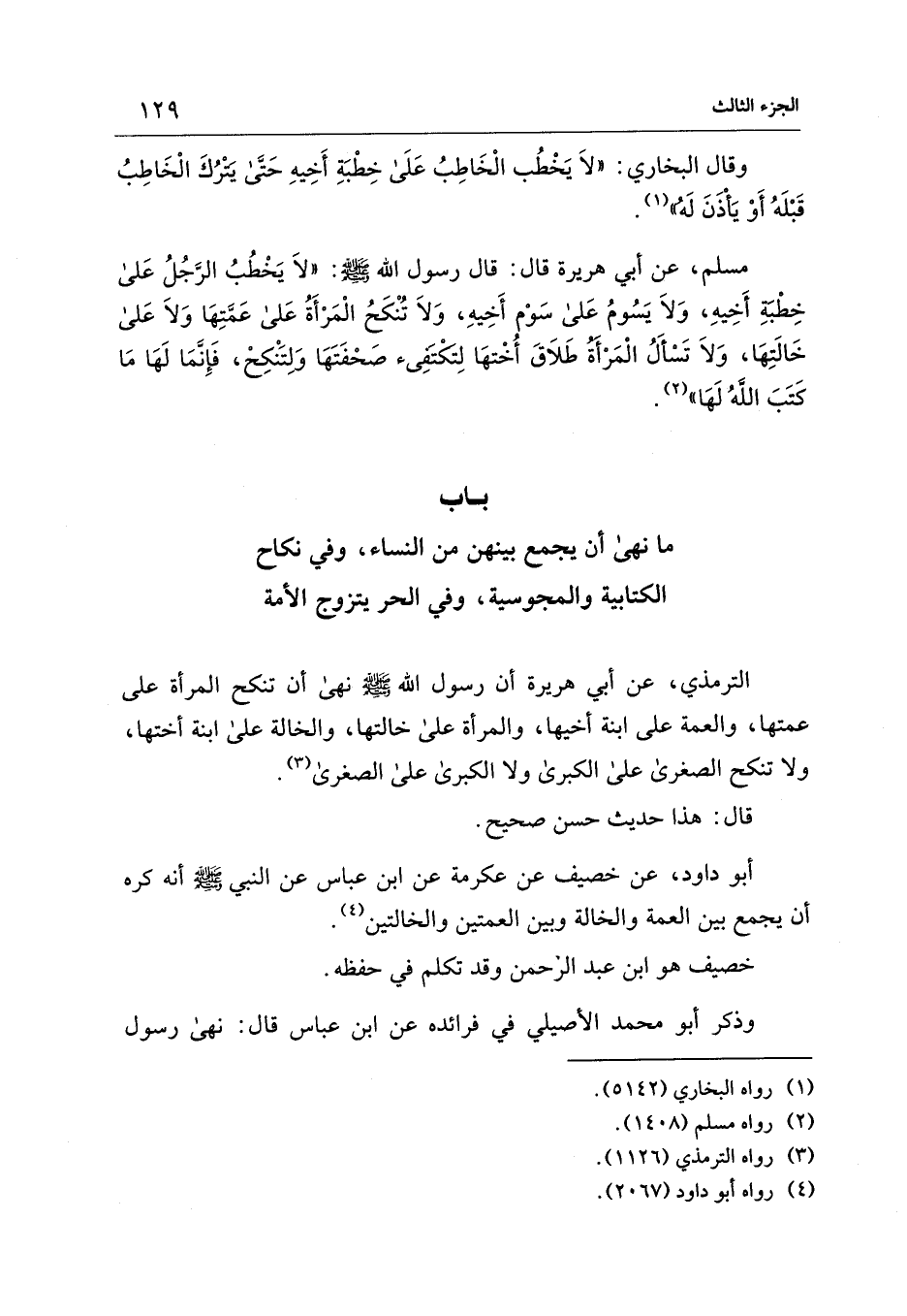 الترمذي، عن أبي هريرة أن رسول الله - صلى الله عليه وسلم - نهى أن تنكح المرأة على عمتها، والعمة على ابنة أخيها، والمرأة على خالتها، والخالة على ابنة أختها، ولا تنكح الصغرى على الكبرى ولا الكبرى على الصغرى (¬3).