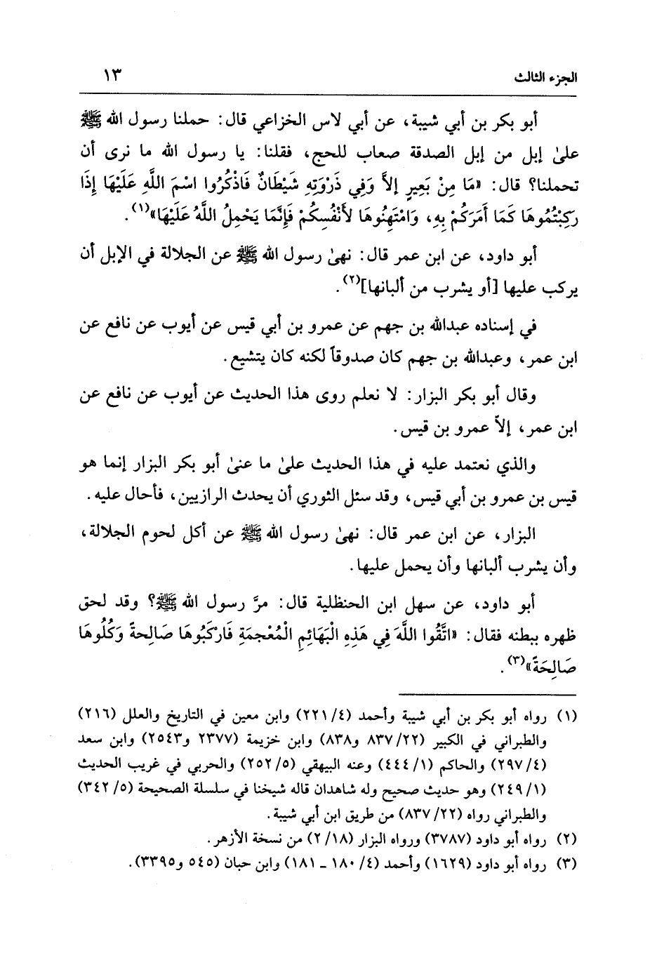 أبو بكر بن أبي شيبة، عن أبي لاس الخزاعي قال: حملنا رسول الله - صلى الله عليه وسلم - على إبل من إبل الصدقة صعاب للحج، فقلنا: يا رسول الله ما نرى أن تحملنا؟ قال: "مَا مِنْ بَعِيرِ إلَّا وَفِي ذَرْوَتهِ شَيْطَانٌ فَاذْكُرُوا اسْمَ اللهِ عَلَيْهَا إِذَا ركِبْتُمُوهَا كَمَا أَمَرَكُمْ بِهِ، وَامْتَهِنُوهَا لأنْفُسِكُمْ فَإنَّمَا يَحْمِلُ اللهُ عَلَيهَا" (¬1).