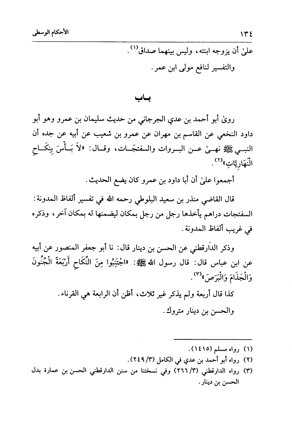 روى أبو أحمد بن عدي الجرجاني من حديث سليمان بن عمرو وهو أبو داود النخعي عن القاسم بن مهران عن عمرو بن شعيب عن أبيه عن جده أن النبي - صلى الله عليه وسلم - نهى عن البروات والسفتجَات، وقال: "لَا بَأْسَ بِنِكَاحِ الْنَهَارِيَّاتِ" (¬2).