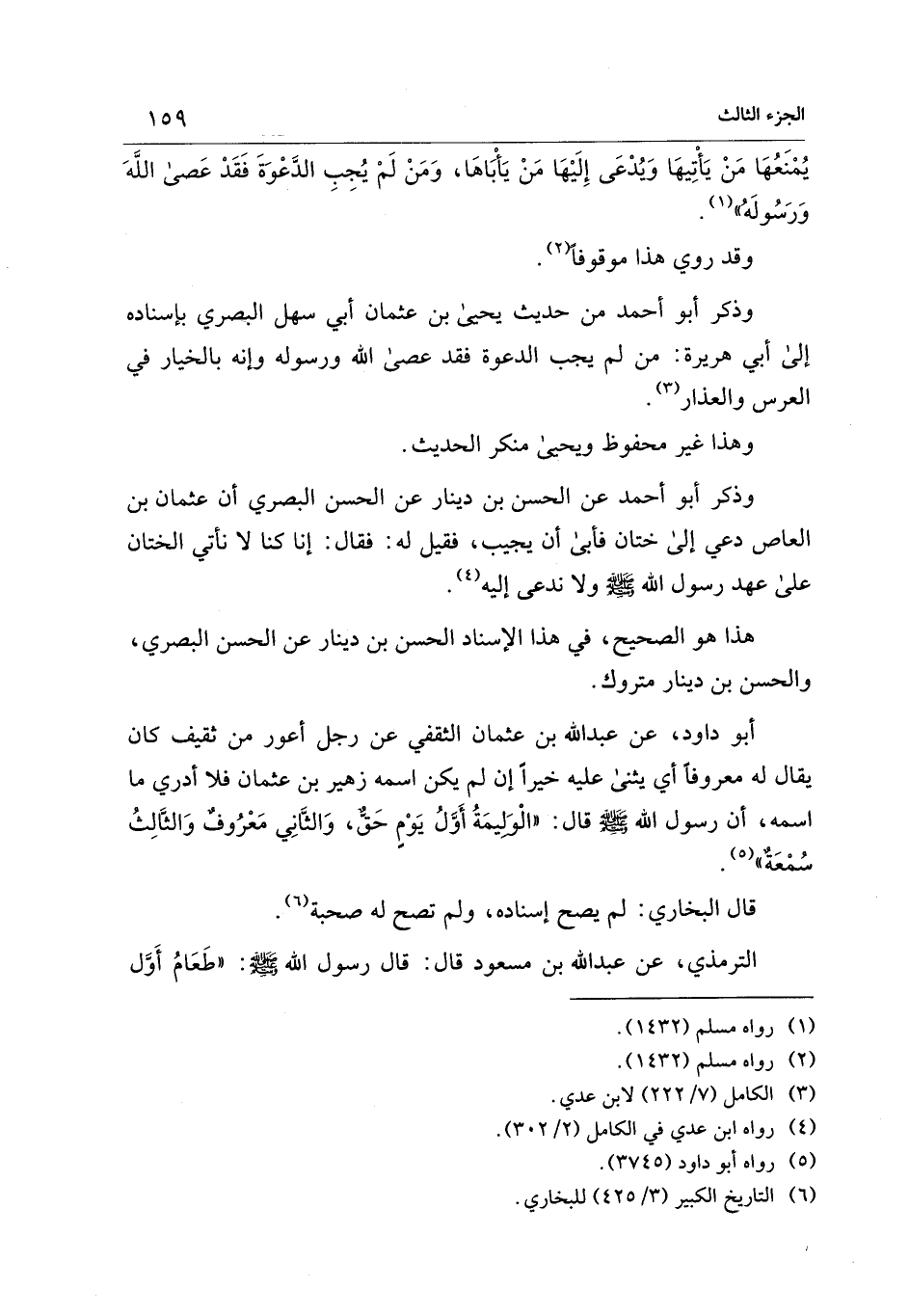 وذكر أبو أحمد من حديث يحيى بن عثمان أبي سهل البصري بإسناده إلى أبي هريرة: من لم يجب الدعوة فقد عصى الله ورسوله وإنه بالخيار في