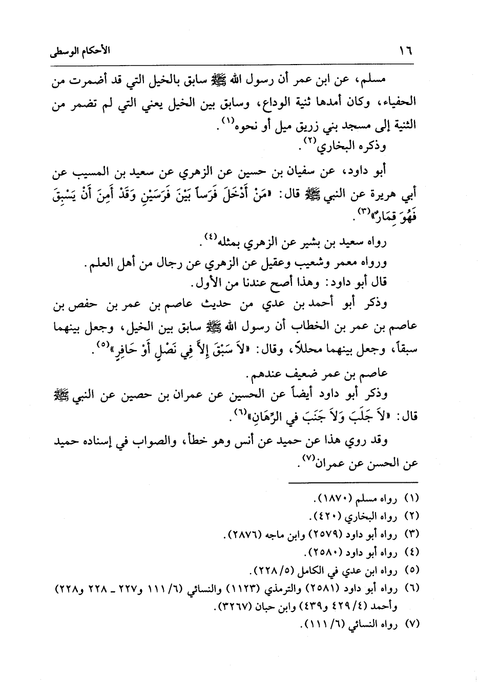 مسلم، عن ابن عمر أن رسول الله - صلى الله عليه وسلم - سابق بالخيل التي قد أضمرت من الحفياء، وكان أمدها ثنية الوداع، وسابق بين الخيل يعني التي لم تضمر من الثنية إلى مسجد بني زريق ميل أو نحوه (¬1).