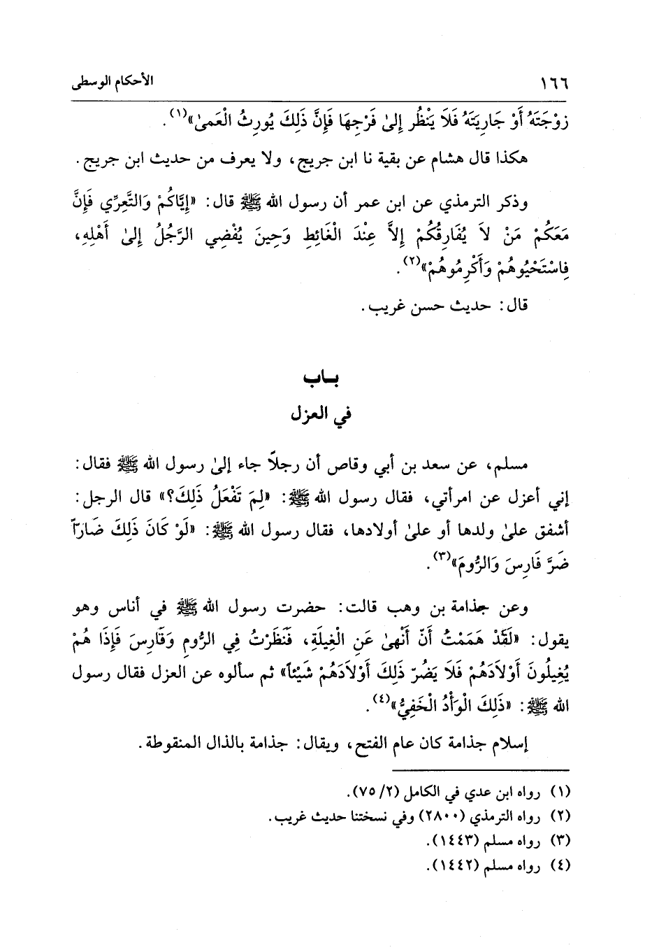 مسلم، عن سعد بن أبي وقاص أن رجلًا جاء إلى رسول الله - صلى الله عليه وسلم - فقال: إني أعزل عن امرأتي، فقال رسول الله - صلى الله عليه وسلم -: "لِمَ تَفْعَلُ ذَلِكَ؟ " قال الرجل: أشفق على ولدها أو على أولادها، فقال رسول الله - صلى الله عليه وسلم -: "لَوْ كَانَ ذَلِكَ ضَارًا
