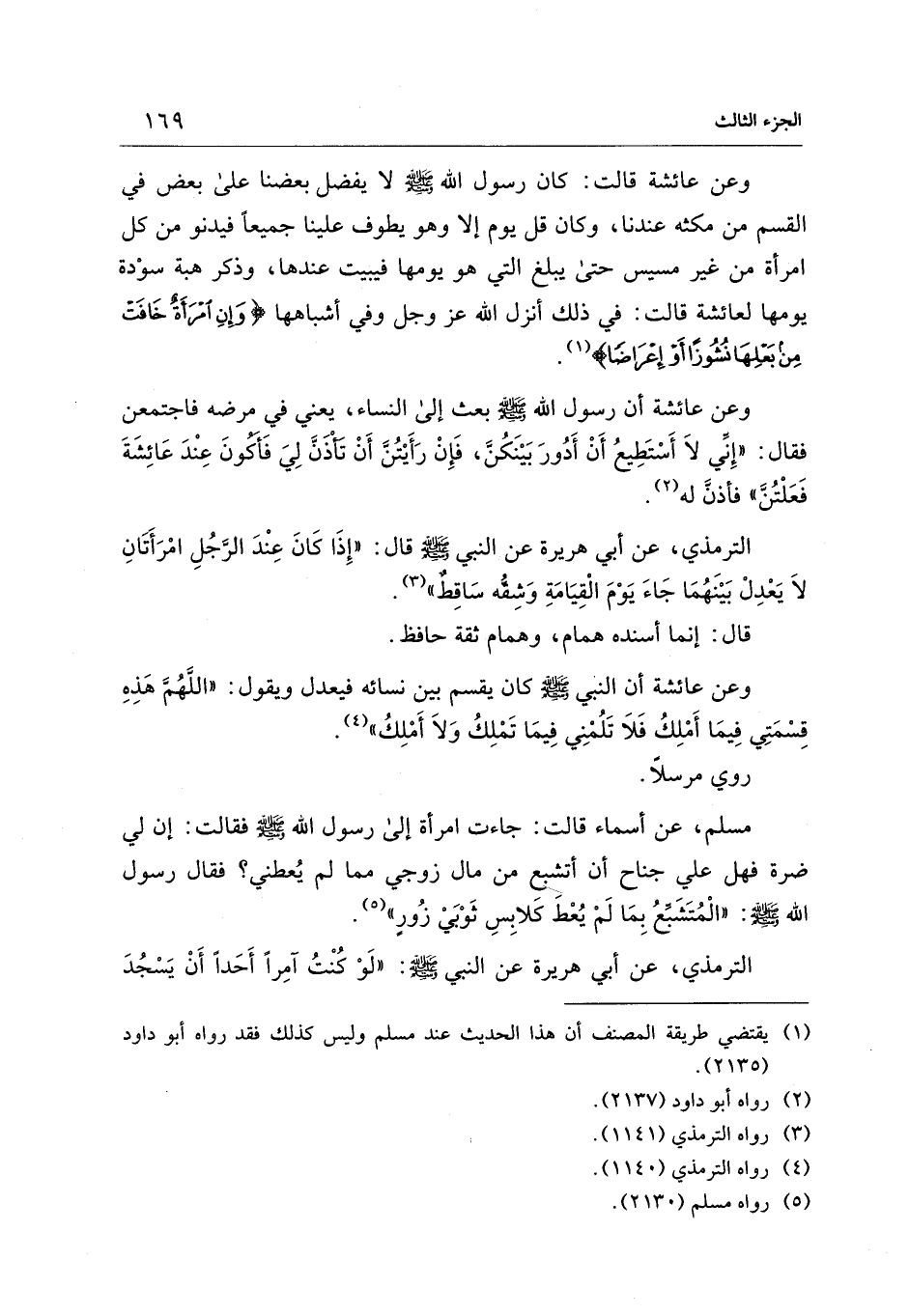 الترمذي، عن أبي هريرة عن النبي - صلى الله عليه وسلم - قال: "إِذَا كَانَ عِنْدَ الرجُلِ امْرَأَتَانِ لاَ يَعْدِلْ بَيْنَهُمَا جَاءَ يَوْمَ الْقِيَامَةِ وَشِقُّه سَاقِطٌ" (¬3).