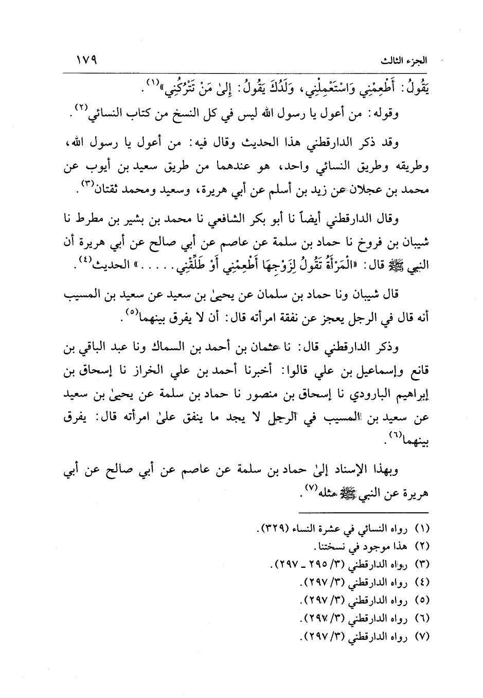 وقد ذكر الدارقطني هذا الحديث وقال فيه: من أعول يا رسول الله، وطريقه وطريق النسائي واحد، هو عندهما من طريق سعيد بن أيوب عن محمد بن عجلان عن زيد بن أسلم عن أبي هريرة، وسعيد ومحمد ثقتان (¬3).