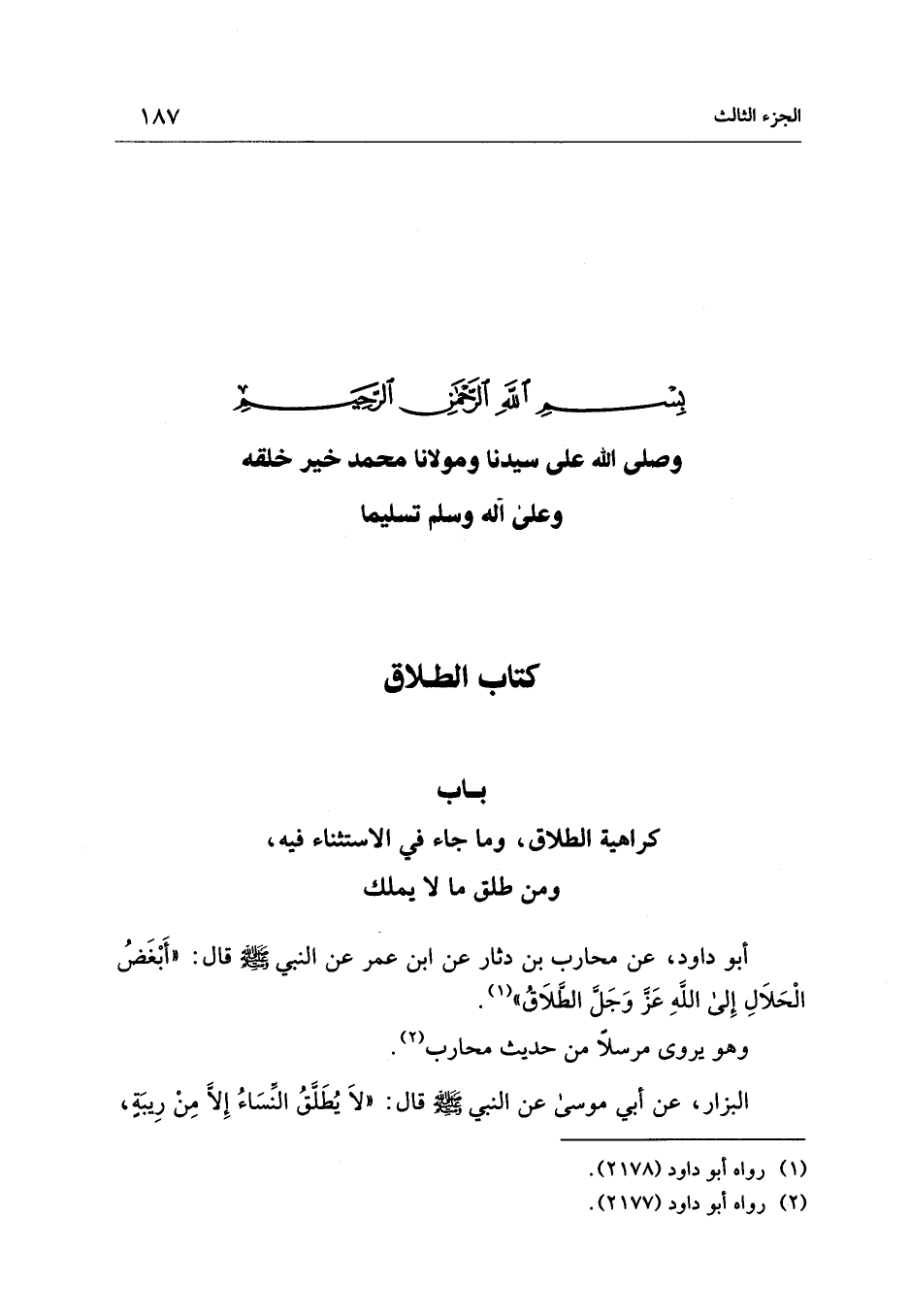 أبو داود، عن محارب بن دثار عن ابن عمر عن النبي - صلى الله عليه وسلم - قال: "أَبْغَضُ الْحَلاَلِ إِلى اللهِ عَزَّ وَجَلَّ الطَّلاَقُ" (¬1).