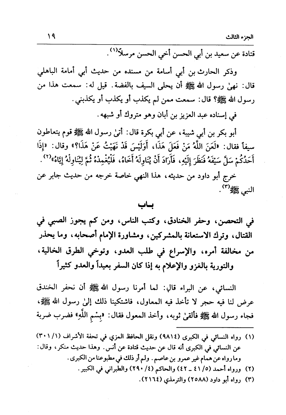 باب في التحصن، وحفر الخنادق، وكتب الناس، ومن كم يجوز الصبي في القتال، وترك الاستعانة بالمشركين، ومشاورة الإمام أصحابه، وما يحذر من مخالفة أمره، والإسراع في طلب العدو، وتوخي الطرق الخالية، والتورية بالغزو والإعلام به إذا كان السفر بعيدًا والعدو كثيرًا