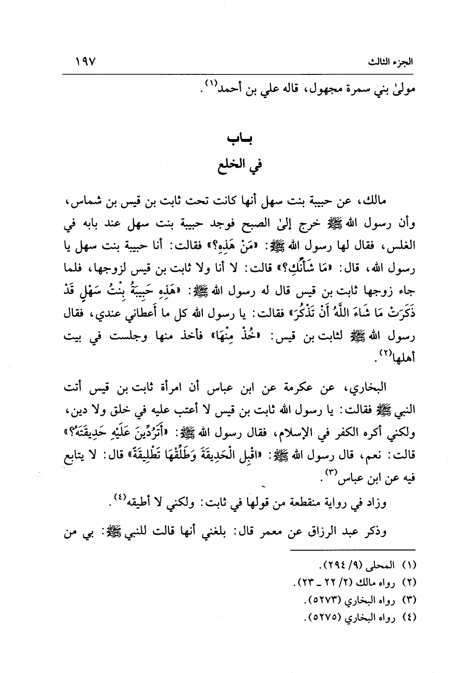 البخاري، عن عكرمة عن ابن عباس أن امرأة ثابت بن قيس أتت النبي - صلى الله عليه وسلم - فقالت: يا رسول الله ثابت بن قيس لا أعتب عليه في خلق ولا دين، ولكني أكره الكفر في الإسلام، فقال رسول الله - صلى الله عليه وسلم -: "أترُدِّينَ عَلَيْهِ حَدِيقَتَهُ؟ " قالت: نعم، قال رسول الله - صلى الله عليه وسلم -: "اقْبِل الْحَدِيقَةَ وَطَلِّقْهَا تَطْلِيقَةَ" قال: لا يتابع فيه عن ابن عباس (¬3).