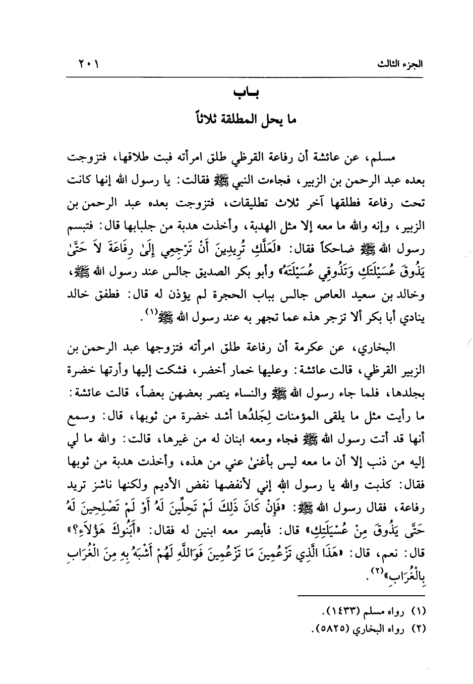 مسلم، عن عائشة أن رفاعة القرظي طلق امرأته فبت طلاقها، فتزوجت بعده عبد الرحمن بن الزبير، فجاءت النبي - صلى الله عليه وسلم - فقالت: يا رسول الله إنها كانت تحت رفاعة فطلقها آخر ثلاث تطليقات، فتزوجت بعده عبد الرحمن بن الزبير، وإنه والله ما معه إلا مثل الهدبة، وأخذت هدبة من جلبابها قال: فتبسم رسول الله - صلى الله عليه وسلم - ضاحكا فقال: "لَعَلَّكِ تُرِيدِينَ أَنْ تَرْجِعِي إِلَى رِفَاعَةَ لاَ حَتَّى يَذُوقَ عُسَيْلَتك وَتَذُوقِي عُسَيْلَتَه" وأبو بكر الصديق جالس عند رسول الله - صلى الله عليه وسلم -، وخالد بن سعيد العاص جالس بباب الحجرة لم يؤذن له قال: فطفق خالد ينادي أبا بكر ألا تزجر هذه عما تجهر به عند رسول الله - صلى الله عليه وسلم - (¬1).