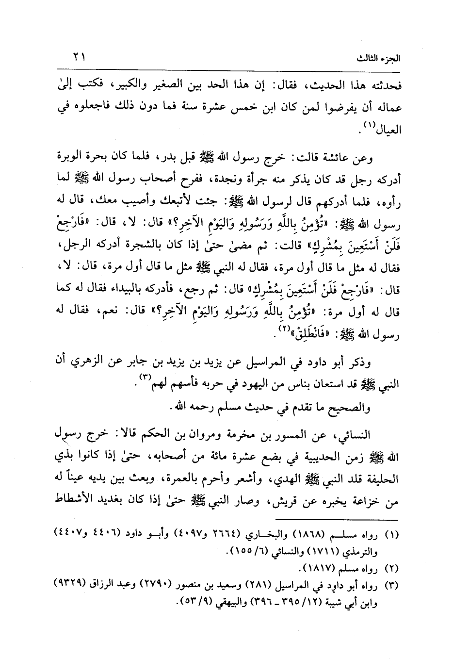 وعن عائشة قالت: خرج رسول الله - صلى الله عليه وسلم - قبل بدر، فلما كان بحرة الوبرة أدركه رجل قد كان يذكر منه جرأة ونجدة، ففرح أصحاب رسول الله - صلى الله عليه وسلم - لما رأوه، فلما أدركهم قال لرسول الله - صلى الله عليه وسلم -: جئت لأتبعك وأصيب معك، قال له رسول الله - صلى الله عليه وسلم -: "تُؤمِنُ بِاللهِ وَرَسُولهِ وَاليَوْمِ الآخِرِ؟ " قال: لا، قال: "فَارْجِعْ فَلَنْ أَسْتَعِينَ بِمُشْرِكٍ" قالت: ثم مضى حتى إذا كان بالشجرة أدركه الرجل، فقال له مثل ما قال أول مرة، فقال له النبي - صلى الله عليه وسلم - مثل ما قال أول مرة، قال: لا، قال: "فَارْجِعْ فَلَنْ أَسْتَعِينَ بِمُشْرِكِ" قال: ثم رجع، فأدركه بالبيداء فقال له كما قال له أول مرة: "تُؤمِنُ باللهِ وَرَسُولهِ وَاليَوْمِ الآخِرِ؟ " قال: نعم، فقال له رسول الله - صلى الله عليه وسلم -: "فَانْطَلِقْ" (¬2).