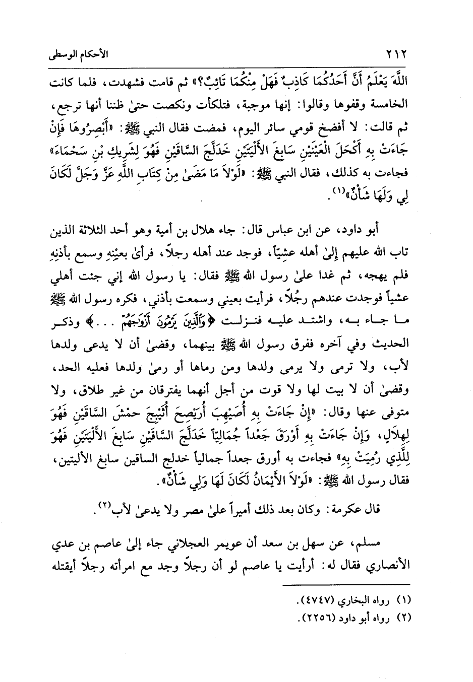 أبو داود، عن ابن عباس قال: جاء هلال بن أمية وهو أحد الثلاثة الذين تاب الله عليهم إِلى أهله عشِيًّا، فوجد عند أهله رجلًا، فرأى بعيِنْهِ وسمع بأذنِهِ فلم يهجه، ثم غدا على رسول الله - صلى الله عليه وسلم - فقال: يا رسول الله إني جئت أهلي عشيًا فوجدت عندهم رجُلًا، فرأيت بعيني وسمعت بأذني، فكره رسول الله - صلى الله عليه وسلم - ما جاء به، واشتد عليه فنزلت {وَالَّذِينَ يَرْمُونَ أَزْوَاجَهُمْ. . .} وذكر الحديث وفي آخره ففرق رسول الله - صلى الله عليه وسلم - بينهما، وقضى أن لا يدعى ولدها لأب، ولا ترمى ولا يرمى ولدها ومن رماها أو رمى ولدها فعليه الحد، وقضى أن لا بيت لها ولا قوت من أجل أنهما يفترقان من غير طلاق، ولا متوفى عنها وقال: "إِنْ جَاءَتْ بِهِ أُصَيْهِبَ أُرَيْصِحَ أثيْبِجَ حمْشَ السَّاقَيْنِ فَهُوَ لِهِلاَلٍ، وَإِنْ جَاءَتْ بِهِ أَوْرَقَ جَعْدًا جُمَالِيًّا خَدَلَّجَ السَّاقَيْنِ سَابغَ الأَلْيتينِ فَهُوَ لِلَّذِي رُمِيَتْ بِهِ " فجاءت به أورق جعدًا جماليًا خدلج الساقين سابغ الأليتين، فقال رسول الله - صلى الله عليه وسلم -: "لَوْلاَ الأيْمَانُ لَكَانَ لَهَا وَلِي شَأنٌ".