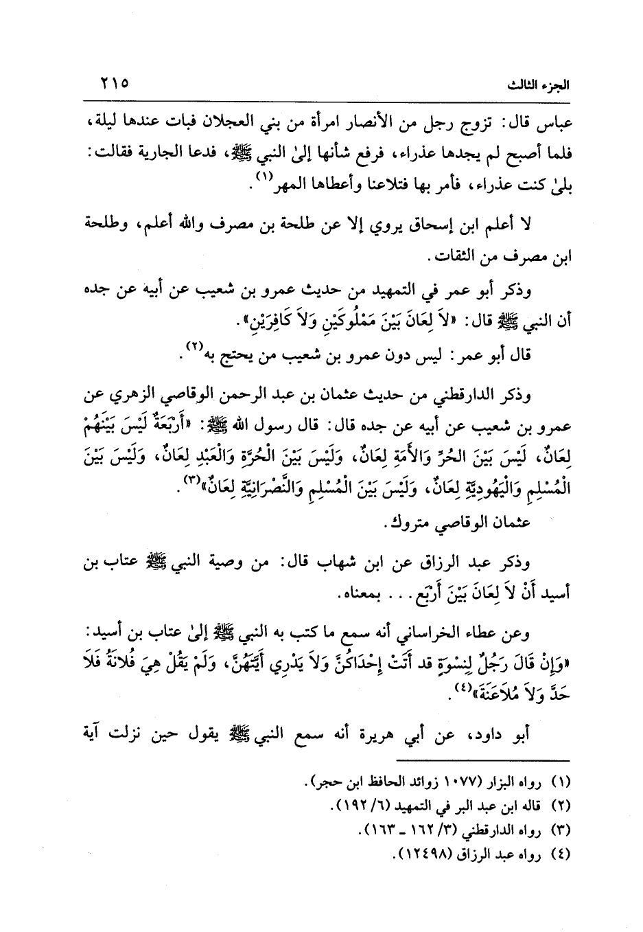 وذكر الدارقطني من حديث عثمان بن عبد الرحمن الوقاصي الزهري عن عمرو بن شعيب عن أبيه عن جده قال: قال رسول الله - صلى الله عليه وسلم -: "أَربعَةٌ لَيْسَ بَيْنَهُمْ لِعَانٌ، لَيْسَ بَيْنَ الحُرِّ وَالأمَةِ لِعَانٌ , وَلَيْسَ بَيْنَ الْحُرَّ وَالْعَبْدِ لِعَانٌ، وَلَيْسَ بَيْنَ الْمُسْلِمِ وَالْيَهُودِيَّةِ لِعَانٌ، وَلَيْسَ بَيْنَ الْمُسْلِمِ وَالنَّصْرَانِيَّه لِعَانٌ" (¬3).