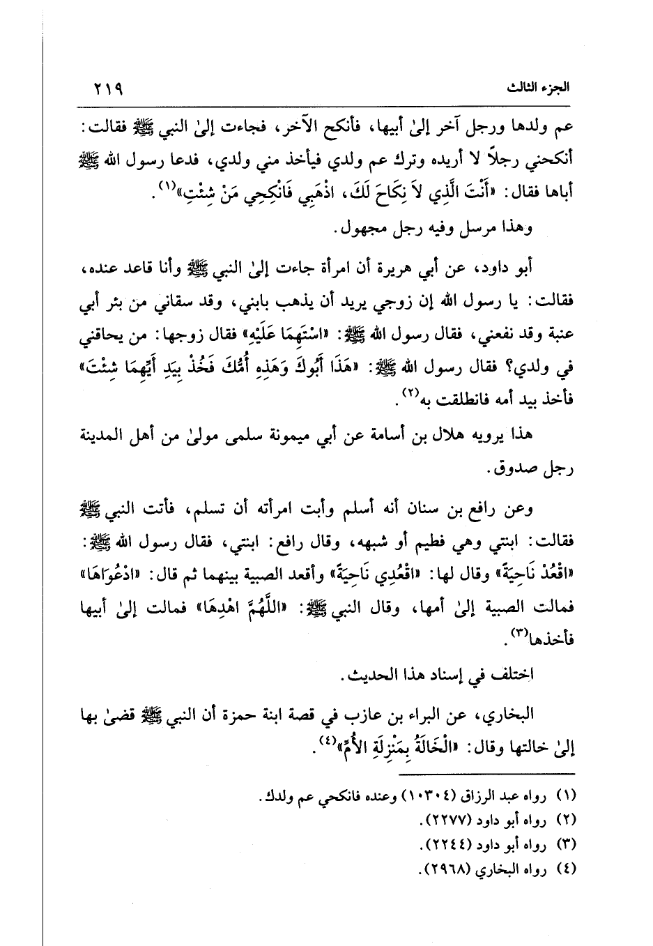 أبو داود، عن أبي هريرة أن امرأة جاءت إلى النبي - صلى الله عليه وسلم - وأنا قاعد عنده، فقالت: يا رسول الله إن زوجي يريد أن يذهب بابني، وقد سقاني من بئر أبي عنبة وقد نفعني، فقال رسول الله - صلى الله عليه وسلم -: "اسْتَهِمَا عَلَيْه" فقال زوجها: من يحاقني في ولدي؟ فقال رسول الله - صلى الله عليه وسلم -: "هَذَا أَبُوكَ وَهَذِهِ أُمُّكَ فَخُذْ بِيَدِ أَيِّهِمَا شِئْتَ" فأخذ بيد أمه فانطلقت به (¬2).