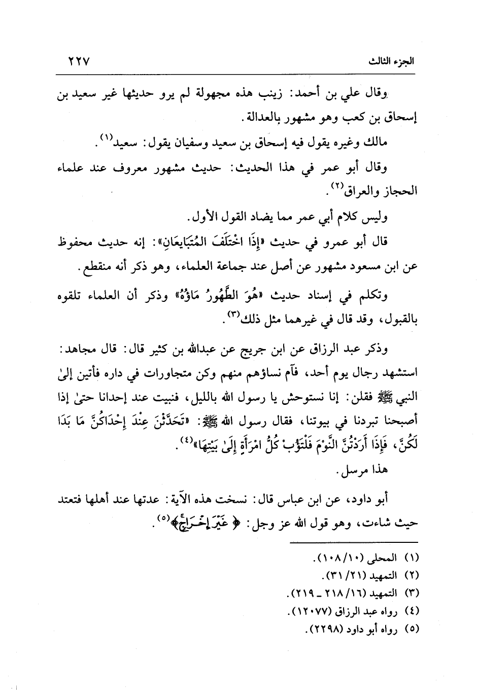 أبو داود، عن ابن عباس قال: نسخت هذه الآية: عدتها عند أهلها فتعتد حيث شاءت، وهو قول الله عز وجل: {غَيْرَ إِخْرَاجٍ} (¬5).