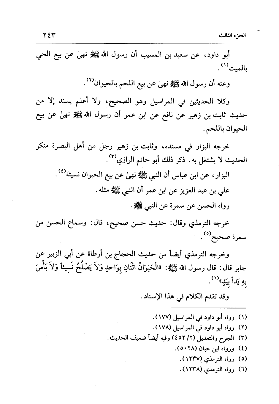 وخرجه الترمذي أيضًا من حديث الحجاج بن أرطاة عن أبي الزبير عن جابر قال: قال رسول الله - صلى الله عليه وسلم -: "الْحَيْوَانُ اثْنَانِ بِواحدٍ وَلاَ يَصْلُحُ نَسِيئًا وَلاَ بَأسَ بِهِ يَدًا بِيَدٍ" (¬6).