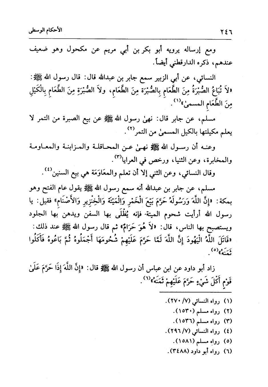النسائي، عن أبي الزبير سمع جابر بن عبد الله قال: قال رسول الله - صلى الله عليه وسلم -: "لاَ تُبَاعُ الصُّبْرَةُ مِنَ الطَّعَامِ بِالصُّبْرَة مِنَ الطَّعَامِ، ولاَ الصُّبْرَةِ مِنَ الطَّعَامِ بِالْكَيْلِ مِنَ الطَّعَامِ المسمى" (¬1).