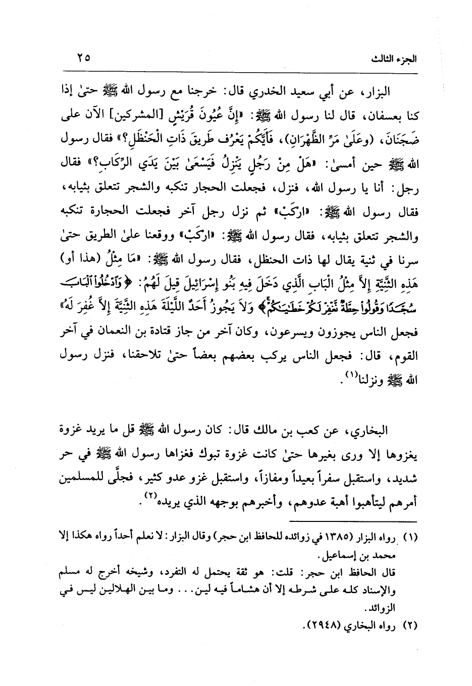 البزار، عن أبي سعيد الخدري قال: خرجنا مع رسول الله - صلى الله عليه وسلم - حتى إذا كنا بعسفان، قال لنا رسول الله - صلى الله عليه وسلم -: "إِنَّ عُيُونَ قُرَيْشٍ [المشركين، الآن على ضَجَنَانَ، (وعَلَى مَرِّ الظَّهْرَانِ)، فَأيَّكُمْ يَعْرُف طَريقَ ذَاتِ الْحَنْظَلِ؟ " فقال رسول الله - صلى الله عليه وسلم - حين أمسى: "هَلْ مِنْ رَجُلٍ يَنْزِلُ فَيَسْعَى بَيْنَ يَدَي الرِّكَابِ؟ " فقال رجل: أنا يا رسول الله، فنزل، فجعلت الحجار تنكبه والشجر تتعلق بثيابه، فقال رسول الله - صلى الله عليه وسلم -: "اركَبْ" ثم نزل رجل آخر فجعلت الحجارة تنكبه والشجر تتعلق بثيابه، فقال رسول الله - صلى الله عليه وسلم -: "اركَبْ" ووقعنا على الطريق حتى سرنا في ثنية يقال لها ذات الحنظل، فقال رسول الله - صلى الله عليه وسلم -: "مَا مِثْلُ (هذا أو) هَذِهِ الثَّنيَّةِ إلَّا مِثْلُ الْبَابِ الَّذِي دَخَلَ فِيهِ بَنُو إِسْرَائِيلَ قِيلَ لَهُمُ: {وَادْخُلُوا الْبَابَ سُجَّدًا وَقُولُوا حِطَّةٌ نَغْفِرْ لَكُمْ خَطَايَاكُمْ} وَلاَ يَجُوزُ أَحَدٌ اللَّيْلَةَ هَذِهِ الثَّنيَّةَ إلَّا غُفِرَ لَهم" فجعل الناس يجوزون ويسرعون، وكان آخر من جاز قتادة بن النعمان في آخر القوم، قال: فجعل الناس يركب بعضهم بعضًا حتى تلاحقنا، فنزل رسول الله - صلى الله عليه وسلم - ونزلنا (¬1).