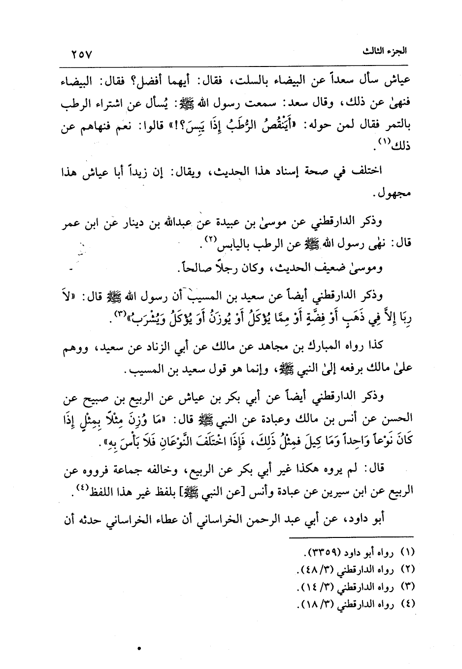 عياش سأل سعدًا عن البيضاء بالسلت، فقال: أيهما أفضل؟ فقال: البيضاء فنهى عن ذلك، وقال سعد: سمعت رسول الله - صلى الله عليه وسلم -: يُسأل عن اشتراء الرطب بالتمر فقال لمن حوله: "أَيَنْقُصُ الرُّطَبُ إِذَا يَبِسَ؟! " قالوا: نعم فنهاهم عن ذلك (¬1).