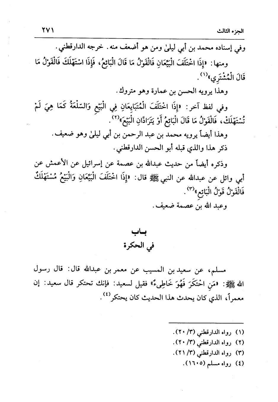 وفي لفظ آخر: "إِذَا اخْتَلَفَ الْمُتَبَايِعَانِ فِي الْبَيْعِ وَالسّلْعَةُ كَمَا هِيَ لَمْ تُسْتَهْلَكْ، فَالْقَوْلُ مَا قَالَ الْبَائِعُ أَوْ يَتَرَادَّانِ الْبَيْعَ" (¬2).