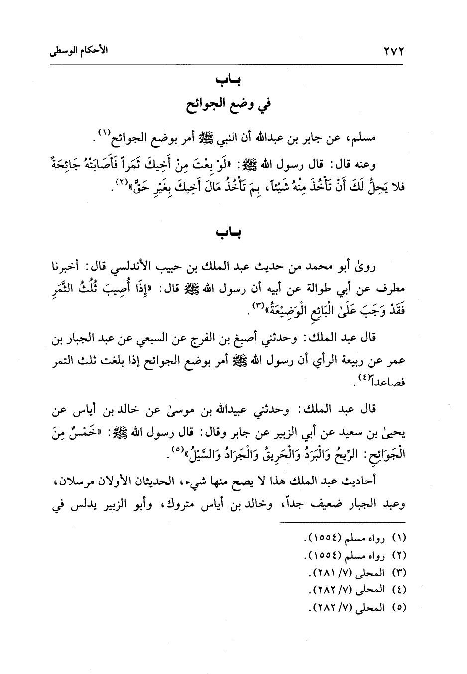 روى أبو محمَّد من حديث عبد الملك بن حبيب الأندلسي قال: أخبرنا مطرف عن أبي طوالة عن أبيه أن رسول الله - صلى الله عليه وسلم - قال: "إِذَا أُصِيبَ ثُلُثُ الثَّمَرِ فَقَدْ وَجَبَ عَلَى الْبَائِعِ الْوَضِيْعَةُ" (¬3).