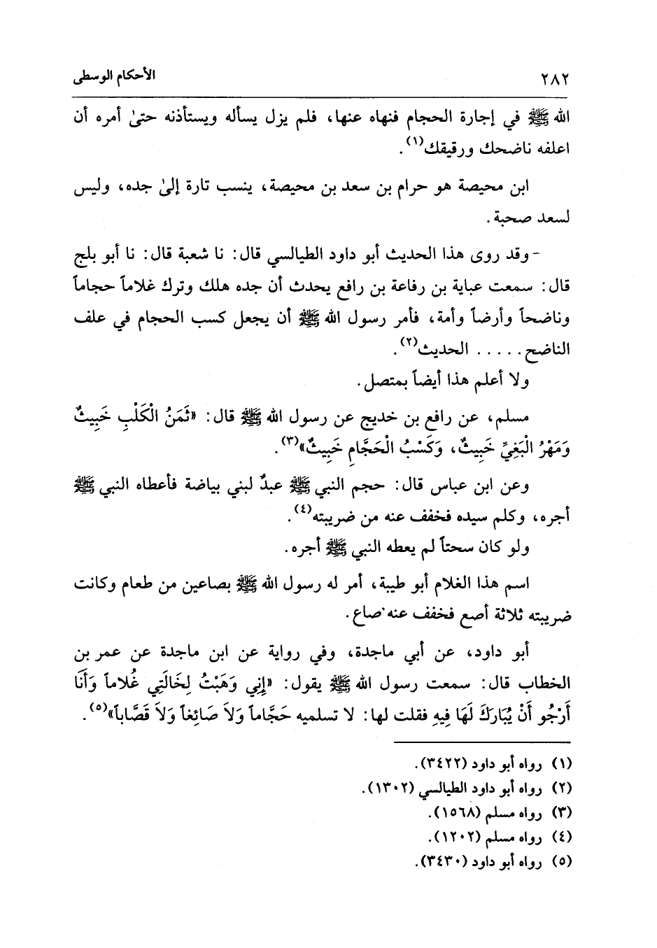 أبو داود، عن أبي ماجدة، وفي رواية عن ابن ماجدة عن عمر بن الخطاب قال: سمعت رسول الله - صلى الله عليه وسلم - يقول: "إِنِي وَهَبْتُ لِخَالَتِي غُلامًا وَأَنَا أَرْجُو أَنْ يُبَارَكَ لَهَا فِيهِ فقلت لها: لا تسلميه حَجَّامًا وَلاَ صَائِغًا وَلاَ قَصَّابًا" (¬5).