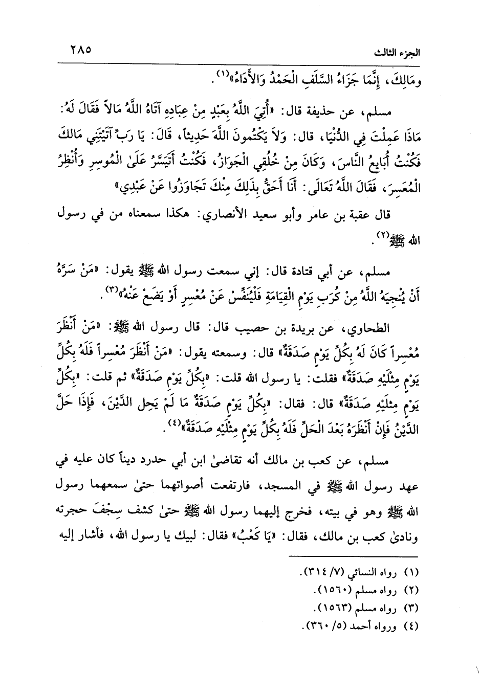 مسلم، عن أبي قتادة قال: إني سمعت رسول الله - صلى الله عليه وسلم - يقول: "مَنْ سَرَّهُ أَنْ يُنْجِيَهُ اللهُ مِنْ كُرَبِ يَوْمِ الْقِيَامَةِ فَلْيُنَفِّسْ عَنْ مُعْسِرٍ أَوْ يَضَعْ عَنْهُ" (¬3).