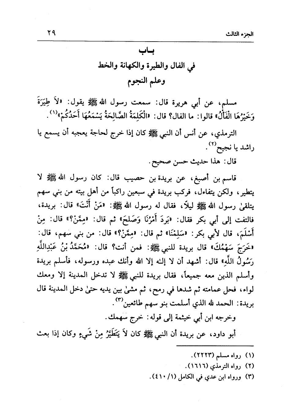 قاسم بن أصبغ، عن بريدة بن حصيب قال: كان رسول الله - صلى الله عليه وسلم - لا يتطير، ولكن يتفاءل، فركب بريدة في سبعين راكبًا من أهل بيته من بني سهم يتلقى رسول الله - صلى الله عليه وسلم - ليلًا، فقال له رسول الله - صلى الله عليه وسلم -: "مَنْ أَنْتَ" قال: بريدة،